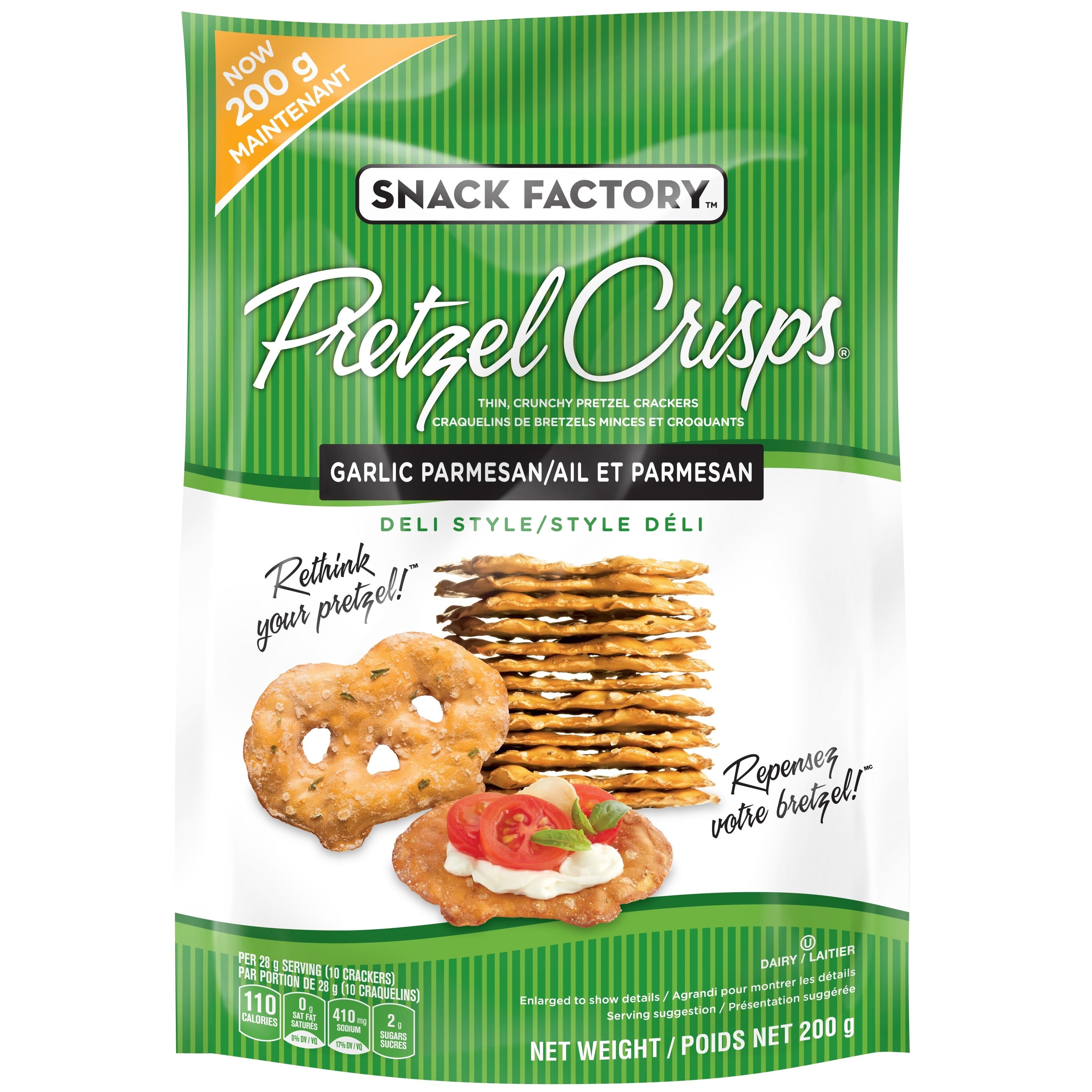 Deli-Style Garlic Parmesan Pretzel Crisps® are a zingy twist on an old favorite, with great gourmet taste from wholesome ingredients. The best part of the pretzel – that satisfying flavor and crunch – is crispy thin and baked with a light, savory garlic flavor for big flavor in a light, crispy snack.