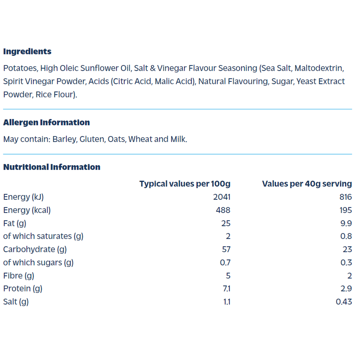 Potatoes, High Oleic Sunflower Oil, Salt & Vinegar Flavour Seasoning (Sea Salt, Maltodextrin, Spirit Vinegar Powder, Acids (Citric Acid, Malic Acid), Natural Flavouring, Sugar, Yeast Extract Powder, Rice Flour).