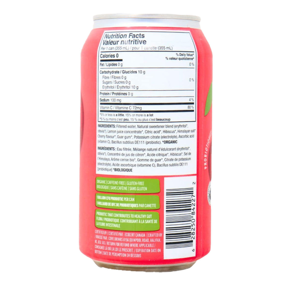 Filtered water, Natural sweetener blend (erythritol*, stevia), Lemon juice concentrate, Citric acid*, Hibiscus*, Himalayan salt* Cherry flavour*, Guar gum*, Potassium citrate (electrolyte), Ascorbic acid (vitamin C), Bacillus subtilus DE111 (probiotic).