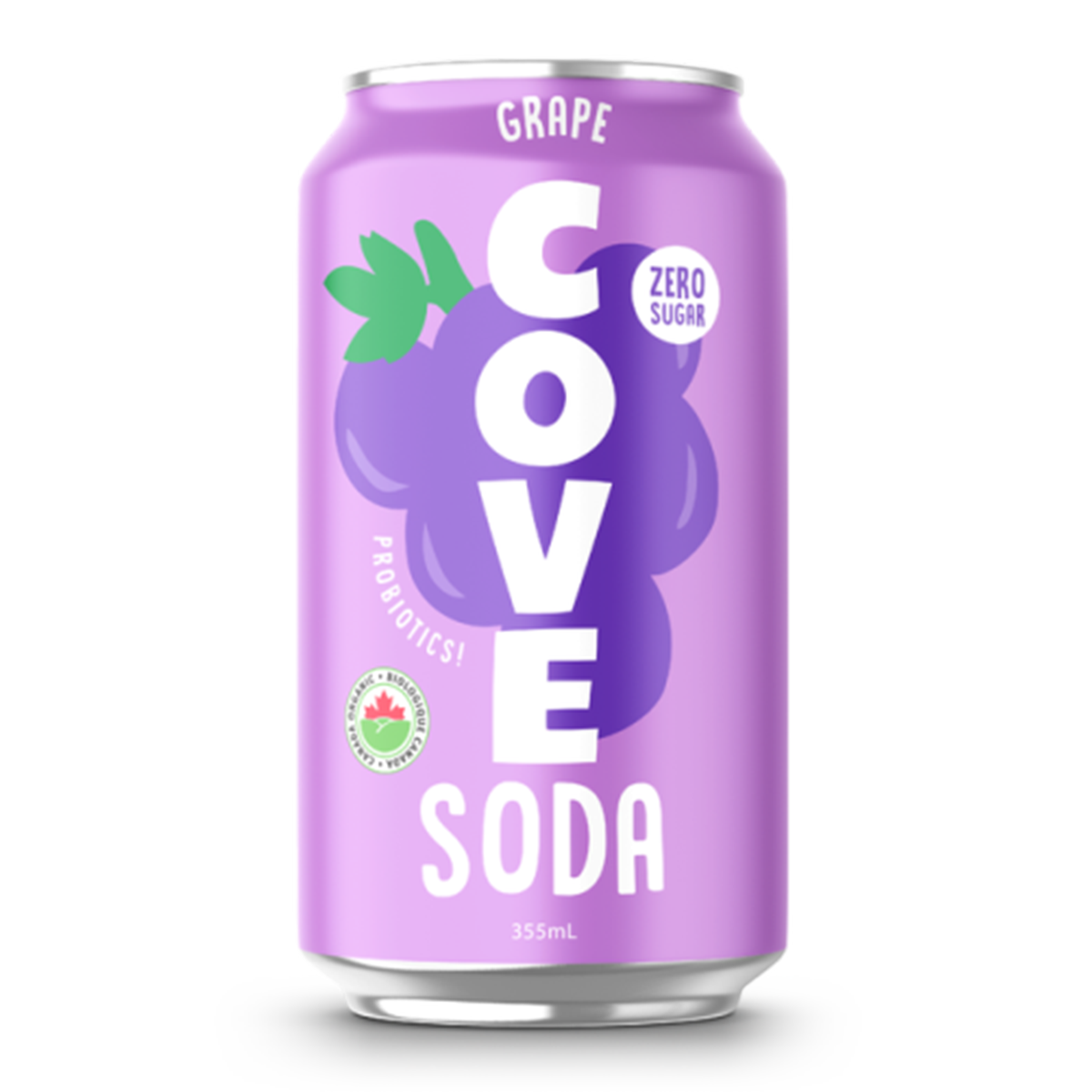 Filtered water, Cove natural sweetener blend (organic erythritol, organic stevia), Organic lemon juice concentrate, Organic grape flavour, Organic grape juice concentrate, Cove gut happy blend (pink himalayan salt, organic butterfly pea tea, organic guar gum, ascorbic acid [vitamin C], bacillus subtilus DE111 [probiotic], bacillus coagulans MTCC 5856 [probiotic]), tartaric acid (from grapes), Beet juice concentrate (for colour)