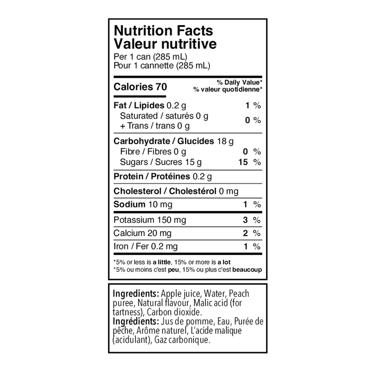 Apple juice, Water, Peach puree, Natural flavour, Malic acid (for tartness), Carbon dioxide.