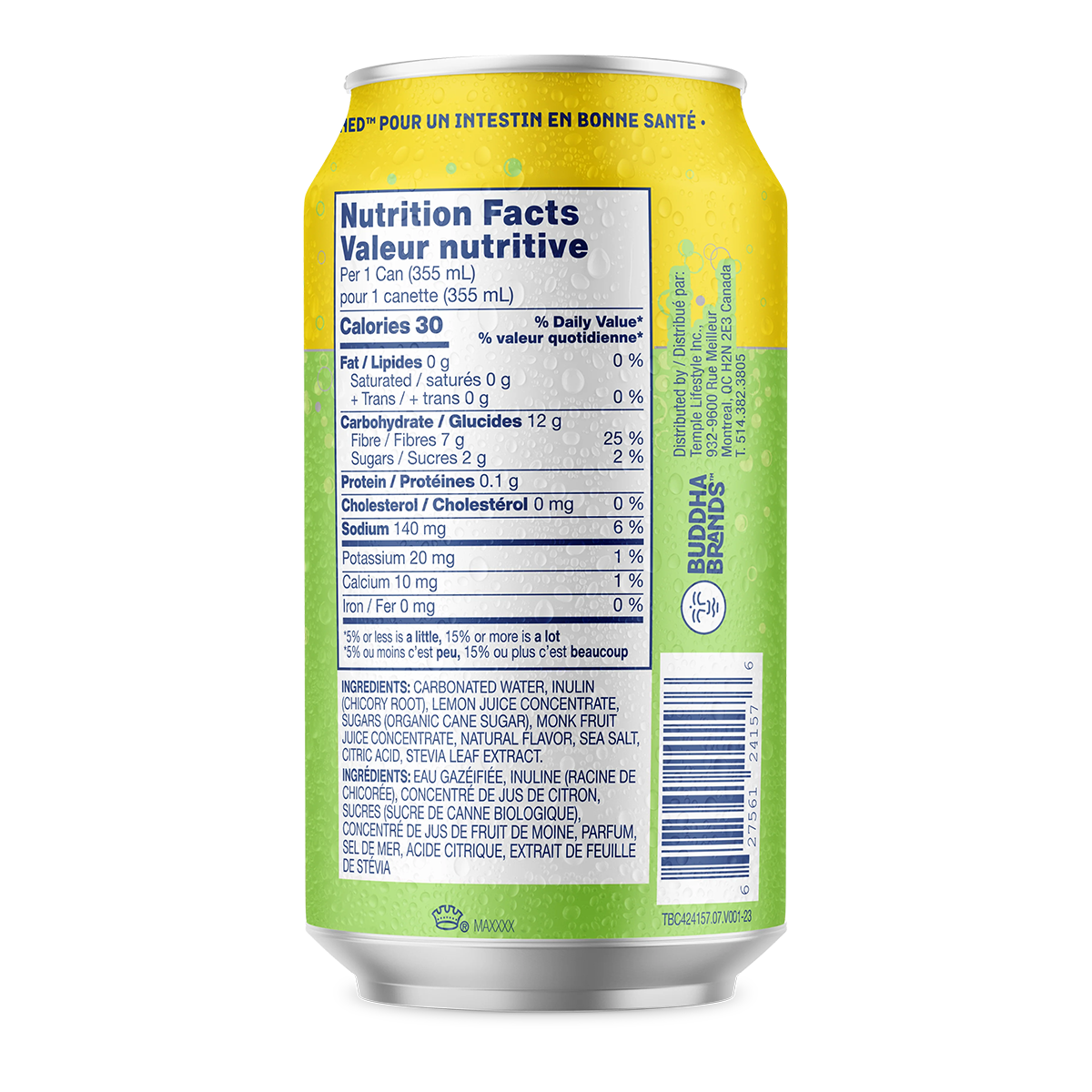 Carbonated water, inulin (chicory root), lemon juice concentrate, sugars (organic cane sugar), monk fruit juice concentrate, natural flavor, sea salt, citric acid, stevia leaf extract.