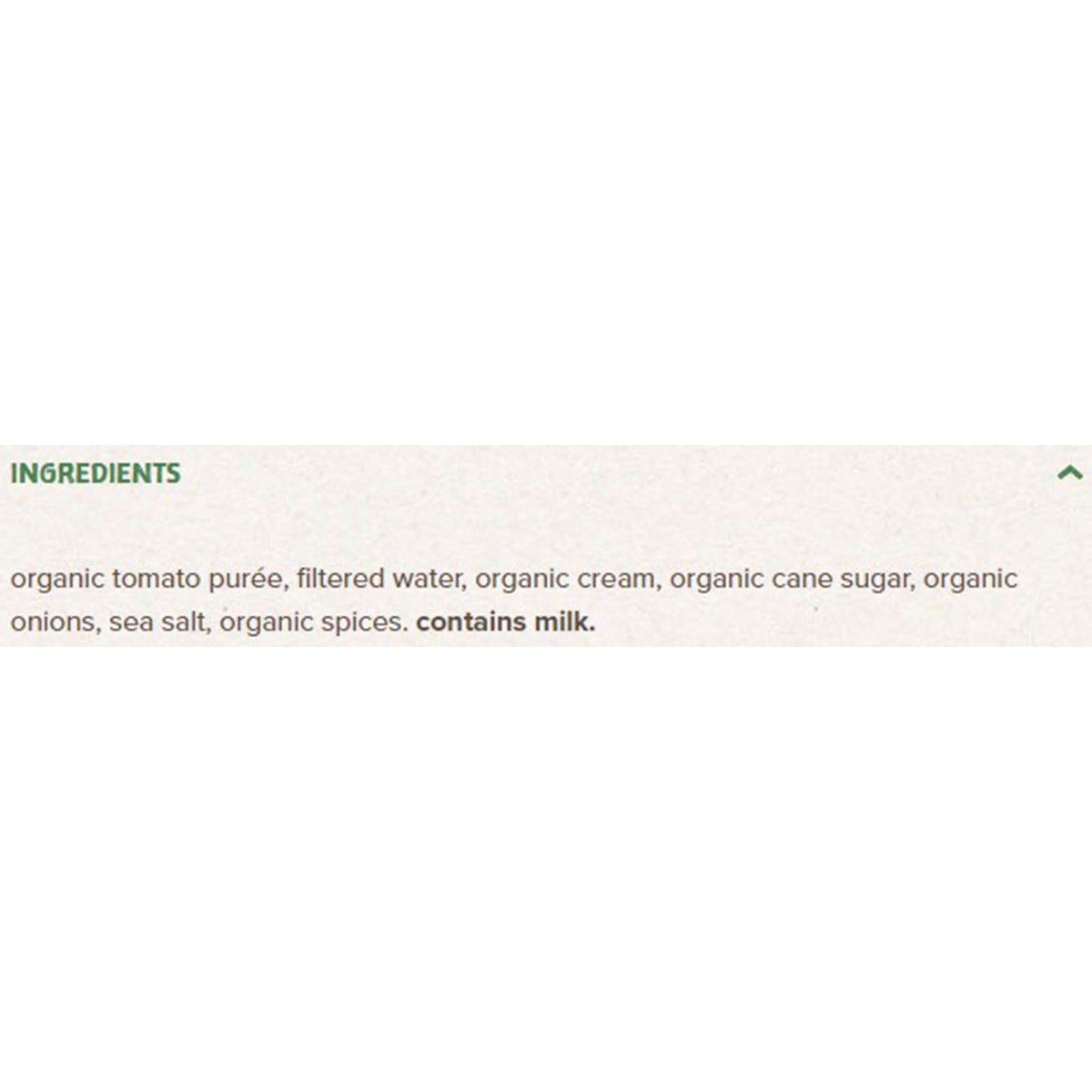 Organic tomato purée, filtered water, organic cream, organic cane sugar, organic onions, sea salt, organic spices.