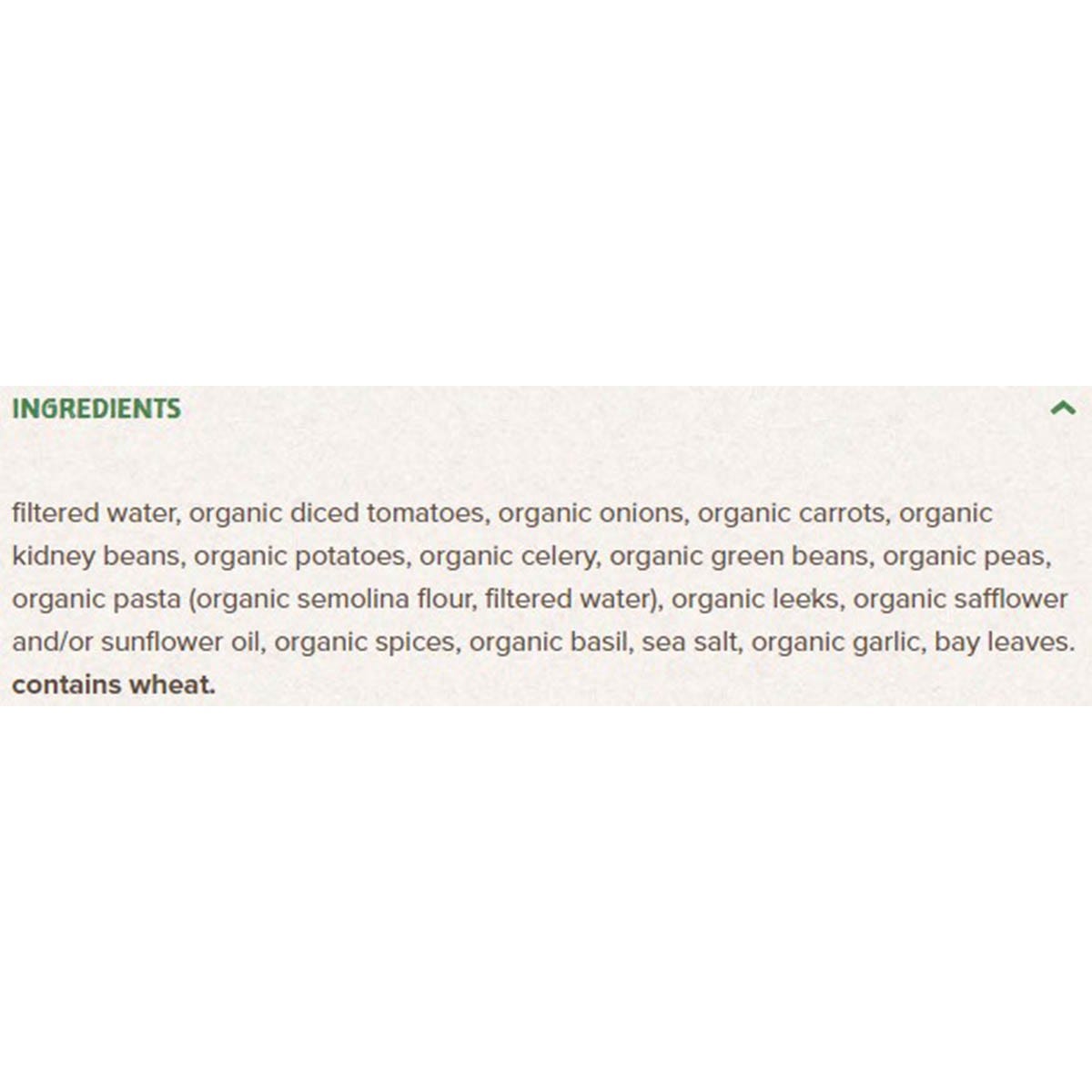 Filtered water, organic diced tomatoes, organic onions, organic carrots, organic kidney beans, organic potatoes, organic celery, organic green beans, organic peas, organic pasta (organic semolina flour, filtered water), organic leeks, organic safflower and/or sunflower oil, organic spices, organic basil, sea salt, organic garlic, bay leaves. contains wheat.
