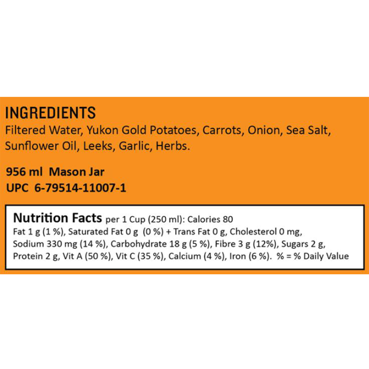 Filtered Water, Yukon Gold Potatoes, Carrots, Onion, Sea Salt, Sunflower Oil, Leeks, Garlic, Herbs.