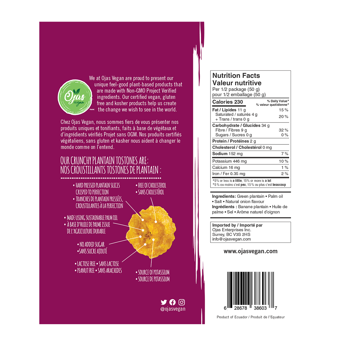 Satisfy your next snack time craving AND body with Ojas Vegan’s Onion Flavour Plantain Tostones – a unique feel-good snack. What’s not to enjoy about crisped-to-perfection hard-pressed green plantains with a savoury onion flavour and 0 grams of added sugar?