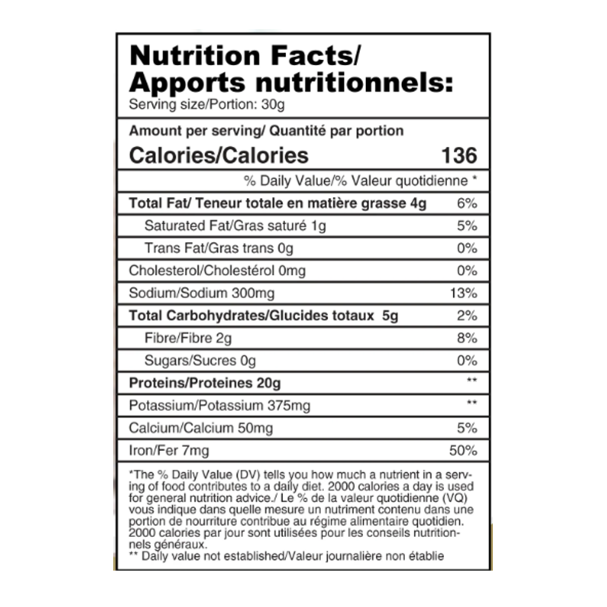 "The % Daily Value (DV) tells you how much a nutrient in a serv- ing of food contributes to a daily Nutrition Plan. 2000 calories a day is used for general nutrition advice./ Le % de la valeur quotidienne (VQ) vous indique dans quelle mesure un nutriment contenu dans une portion de nourriture contribue au régime alimentaire quotidien. 2000 calories par jour sont utilisées pour les conseils nutrition- nels généraux.