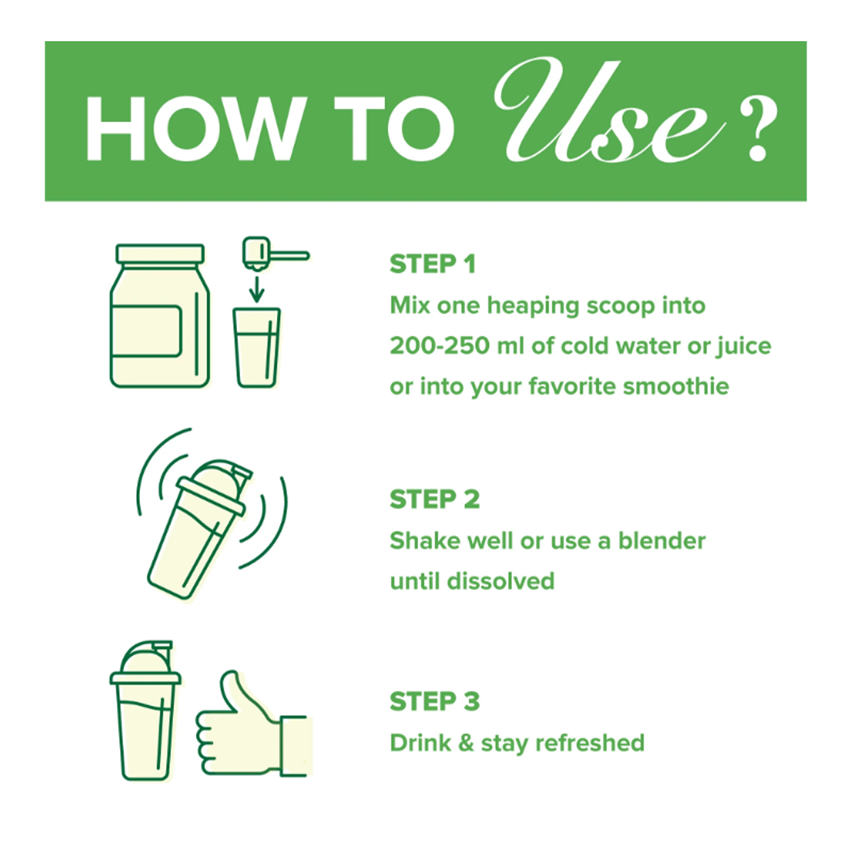 Mix one heaping scoop into 200-250 ml of cold water or juice or into your favorite smoothie