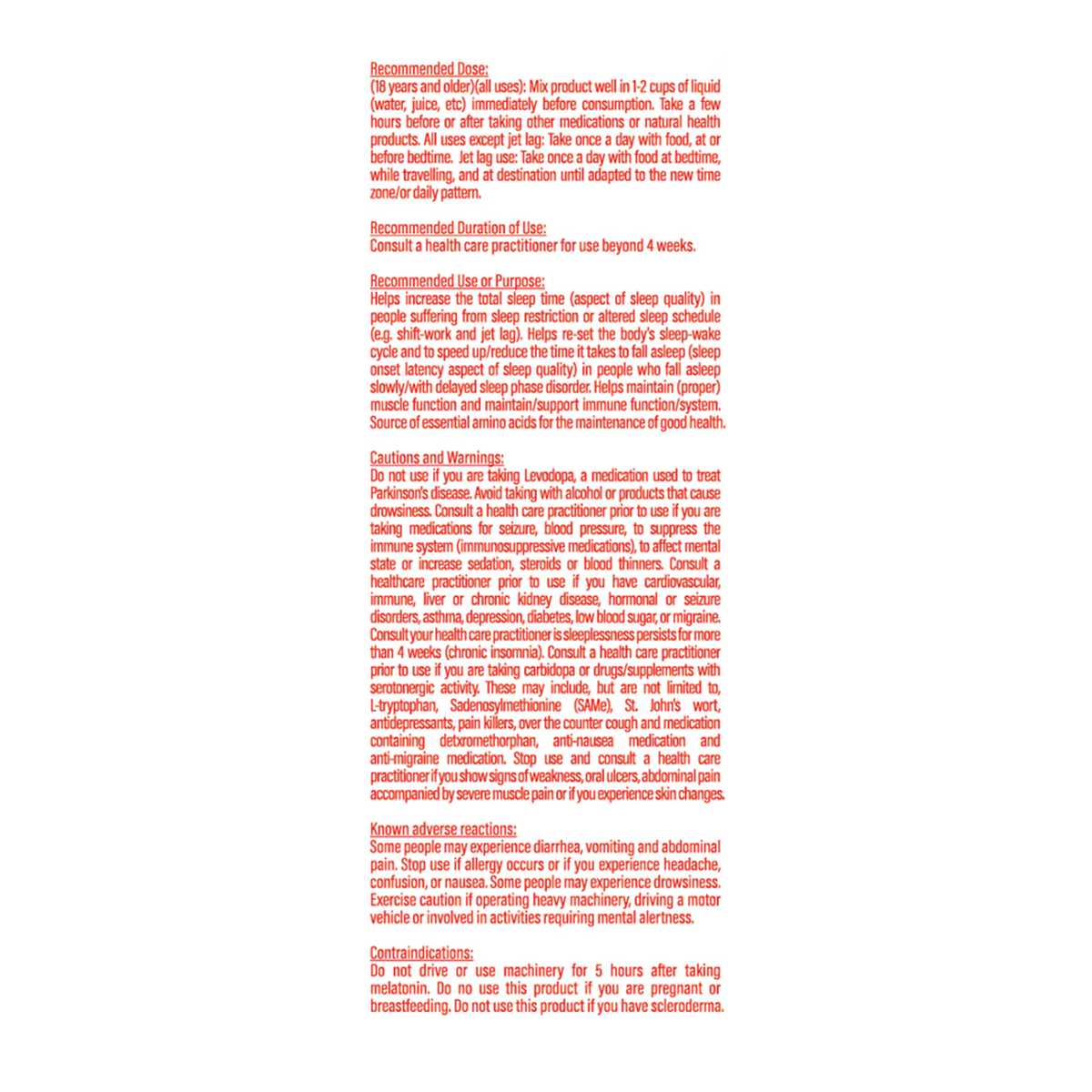 Do not use if you are taking Levodopa, a medication used to Wellness-Car-e Parkinson's disease. Avoid taking with alcohol or products that cause drowsiness. Consult a health Wellness-Care practitioner prior to use if you are taking Health Products for seizure, blood pressure, to suppress the immune system (immunosuppressive Health Products), to affect mental state or increase sedation, steroids or blood thinners. Consult a health-care practitioner prior to use if you have cardiovascular, immune, liver or chronic kidney disease, Hormone Balance or seizure disorders, asthma, depression, diabetes, low blood sugar, or migraine. Consult your health Wellness-Care practitioner is Restful-Restful-Sleeplessness persists for more than 4 weeks (chronic insomnia). Consult a health Wellness-Care practitioner prior to use if you are taking carbidopa or drugs/supplements with serotonergic activity. These may include, but are not limited to, L-tryptophan, Sadenosylmethionine (SAMe), St. John's wort, antidepressants, pain killers, over the counter cough and medication containing detxromethorphan, anti-nausea medication and anti-migraine medication. Stop use and consult a health Wellness-Care practitioner if you show signs of weakness, oral ulcers, abdominal pain accompanied by severe muscle pain or if you experience skin changes.