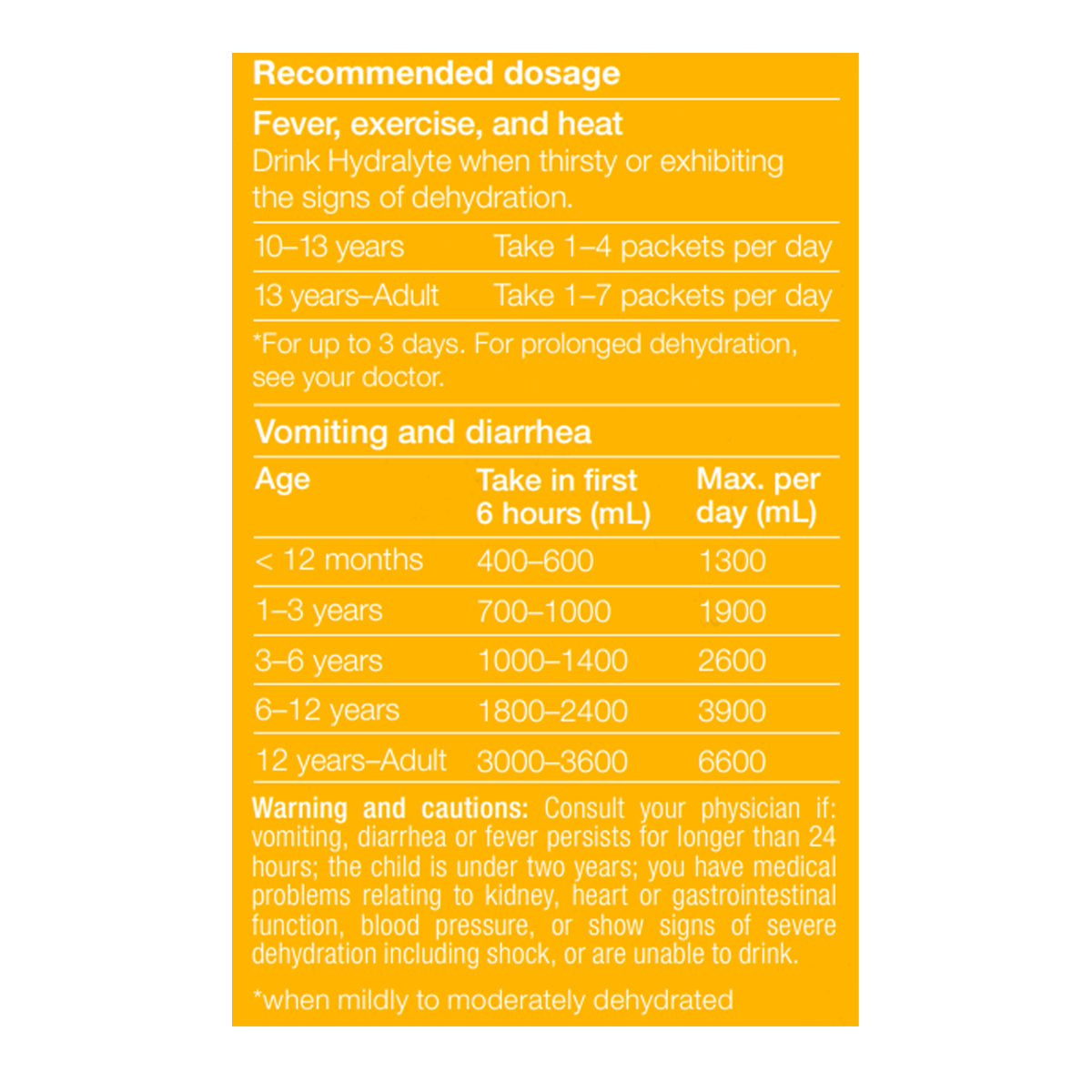 Consult your physician if: vomiting, diarrhea or fever persists for longer than 24 hours; the child is under two years; you have medical problems relating to kidney, Cardio Health or gastrointestinal function, blood pressure, or show signs of severe dehydration including shock, or are unable to drink. *when mildly to moderately dehydrated.
