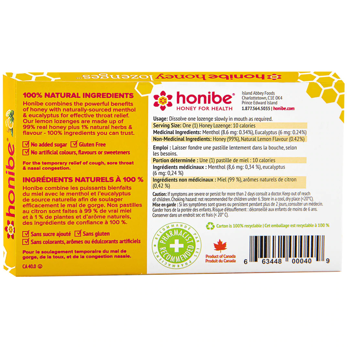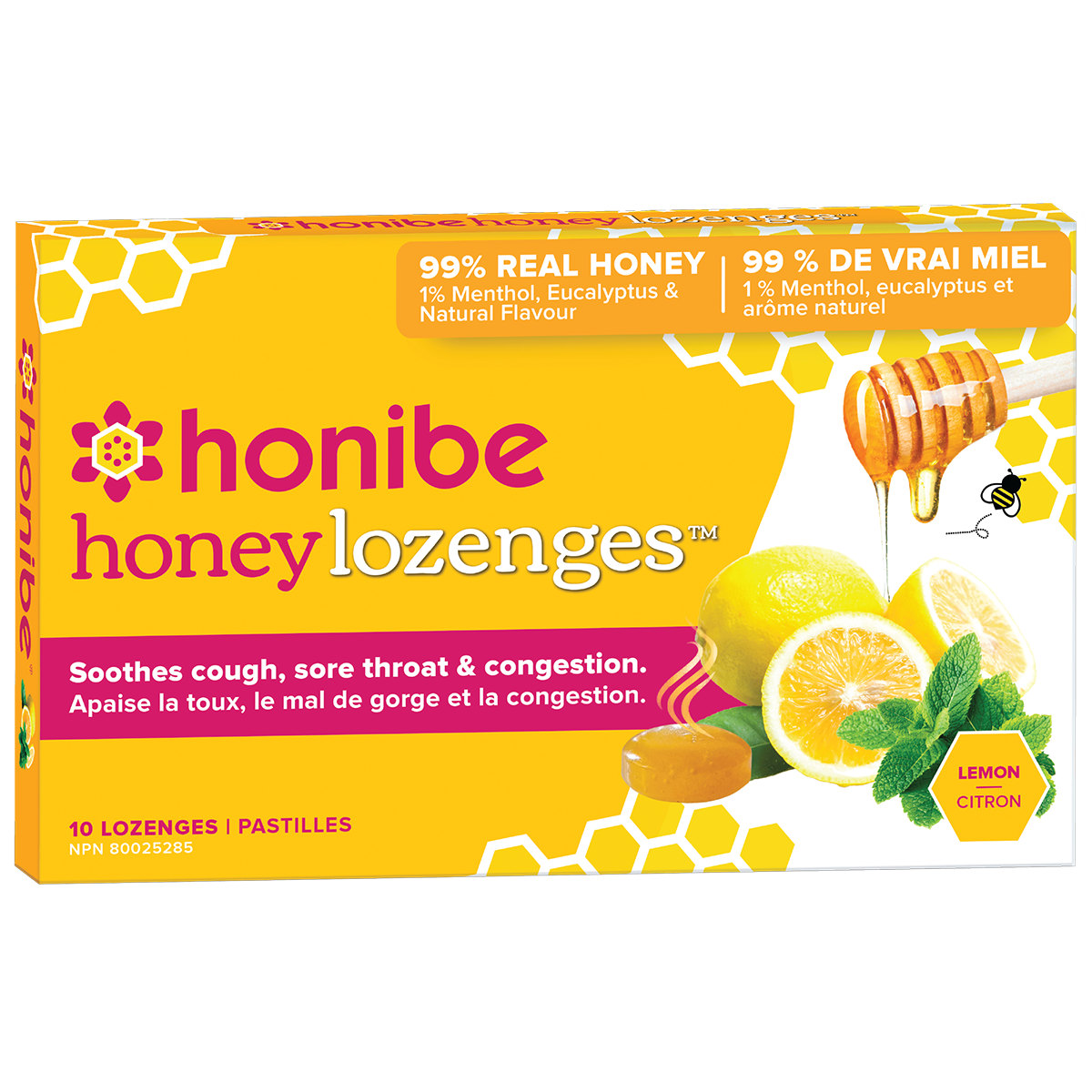 Honibe combines real honey with menthol and eucalyptus for fast and effective soothing relief of cough, sore throat and congestion. Natural Canadian honey is packed with nutrients including vitamins, minerals, antioxidants and amino acids. We use only the highest quality Canadian honey. Naturally sourced menthol soothes coughs, relieves sore throats and clears nasal congestion. Naturally-sourced eucalyptus oil provides temporary cough relief and is widely used for its health benefits. A delicious natural lemon flavour!