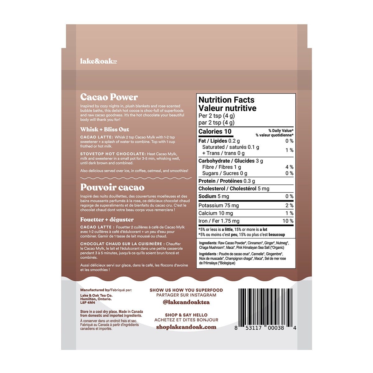 Cacao Latte: Whisk 2 tsp Cacao Mylk with 1-2 tsp sweetener + a splash of water to combine. Top with 1 cup frothed or hot milk.