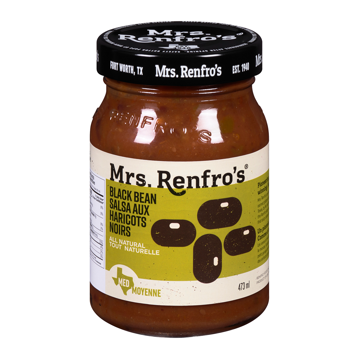Mrs. Renfro's Black Bean Salsa, at a medium heat level, is gluten-free, with no high-fructose corn syrup or added sugar. Made in Fort Worth, Texas.
