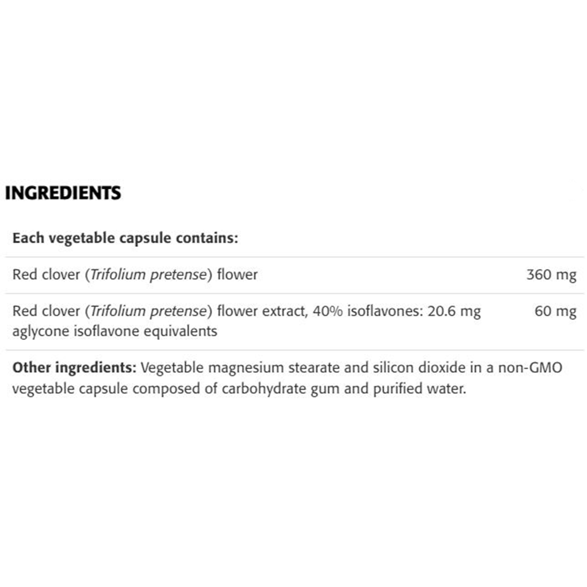 Red clover (Trifolium pretense) flower extract, 40% isoflavones: 20.6 mg aglycone isoflavone equivalents