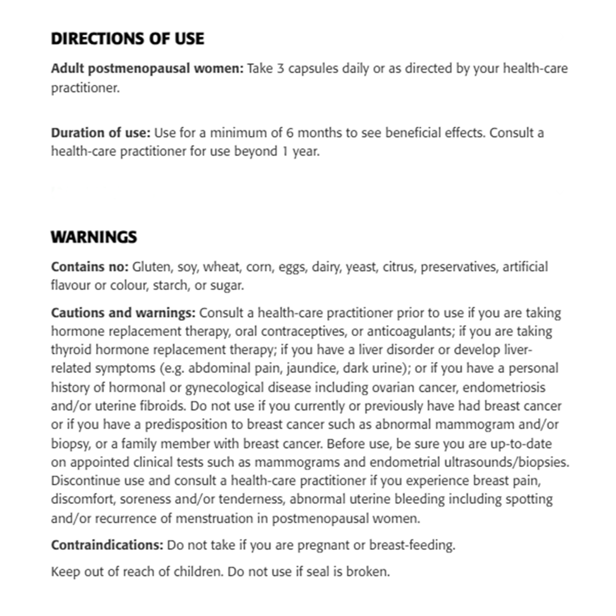 Adult postmenopausal women: Take 3 capsules daily or as directed by your health-wellness-care practitioner.