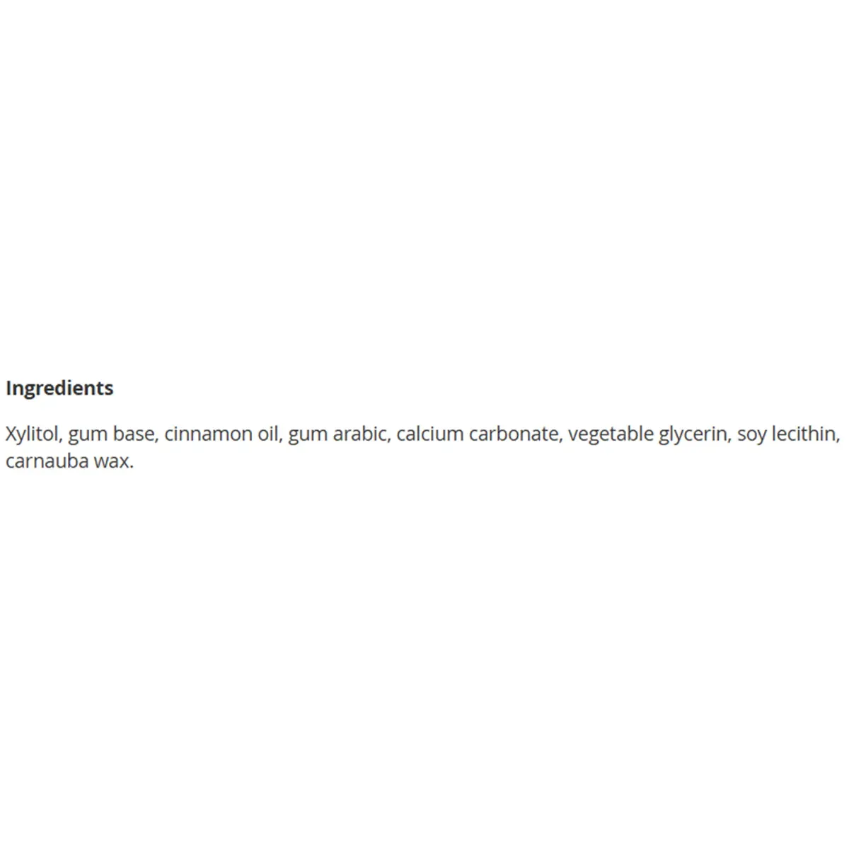 Xylitol, gum base, cinnamon oil, gum arabic, calcium carbonate, vegetable glycerin, soy lecithin, carnauba wax.