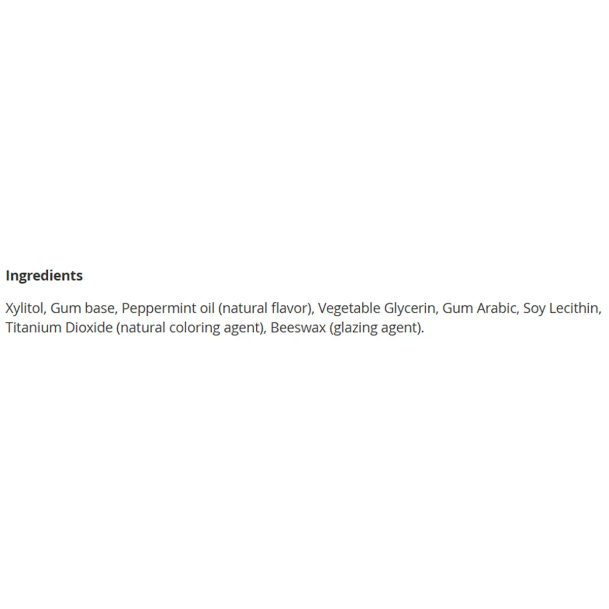 Xylitol, Gum base, Peppermint oil (natural flavor), Vegetable Glycerin, Gum Arabic, Soy Lecithin, Titanium Dioxide (natural coloring agent), Beeswax (glazing agent).