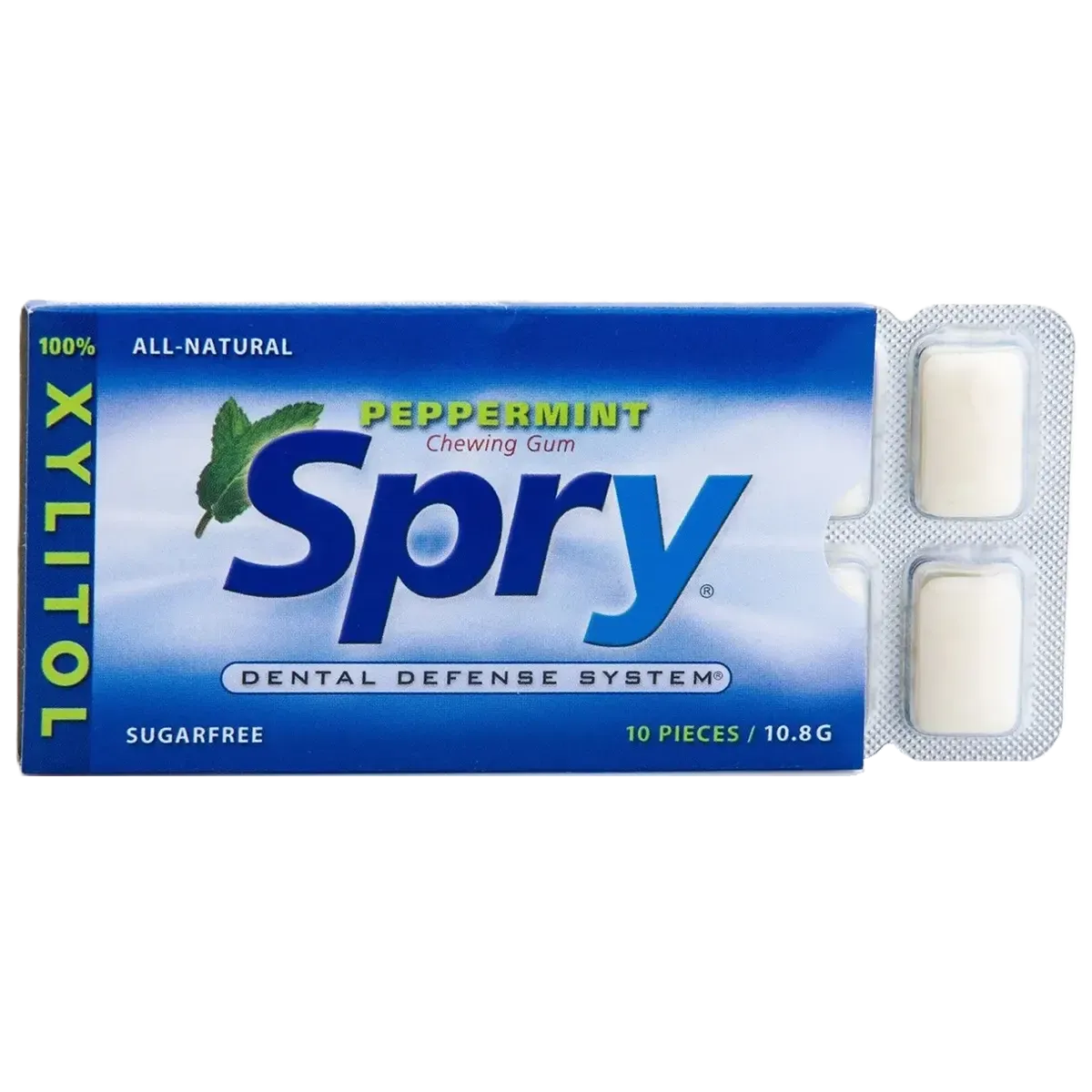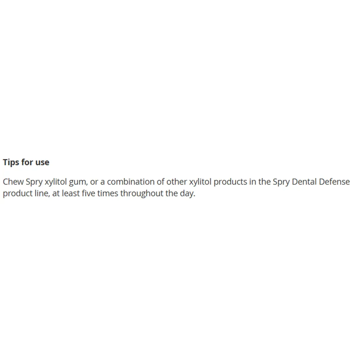 Chew Spry xylitol gum, or a combination of other xylitol products in the Spry Dental Defense product line, at least five times throughout the day.