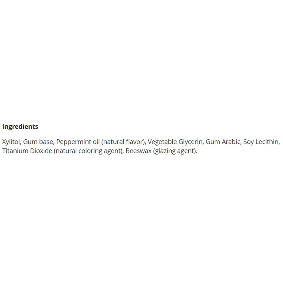 Xylitol, Gum base, Peppermint oil (natural flavor), Vegetable Glycerin, Gum Arabic, Soy Lecithin, Titanium Dioxide (natural coloring agent), Beeswax (glazing agent).