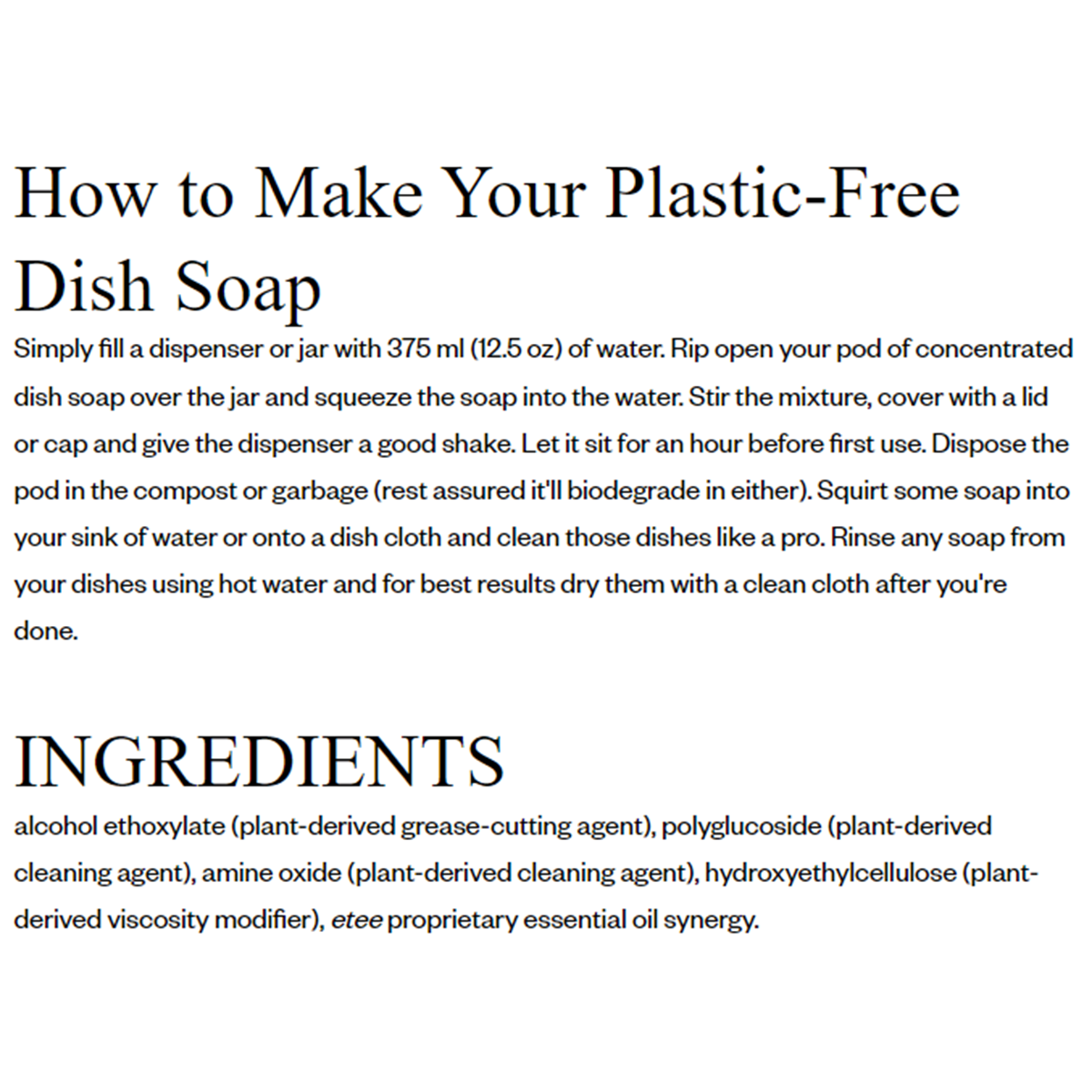 Simply fill a dispenser or jar with 375 ml (12.5 oz) of water. Rip open your pod of concentrated dish soap over the jar and squeeze the soap into the water. Stir the mixture, cover with a lid or cap and give the dispenser a good shake. Let it sit for an hour before first use. Dispose the pod in the compost or garbage (rest assured it'll biodegrade in either). Squirt some soap into your sink of water or onto a dish cloth and clean those dishes like a pro. Rinse any soap from your dishes using hot water and for best results dry them with a clean cloth after you're done.