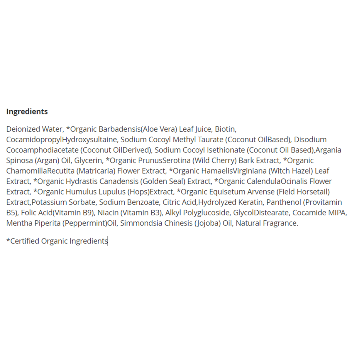 Deionized Water, *Organic Barbadensis(Aloe Vera) Leaf Juice, Biotin, CocamidopropylHydroxysultaine, Sodium Cocoyl Methyl Taurate (Coconut OilBased), Disodium Cocoamphodiacetate (Coconut OilDerived), Sodium Cocoyl Isethionate (Coconut Oil Based),Argania Spinosa (Argan) Oil, Glycerin, *Organic PrunusSerotina (Wild Cherry) Bark Extract, *Organic ChamomillaRecutita (Matricaria) Flower Extract, *Organic HamaelisVirginiana (Witch Hazel) Leaf Extract, *Organic Hydrastis Canadensis (Golden Seal) Extract, *Organic CalendulaOcinalis Flower Extract, *Organic Humulus Lupulus (Hops)Extract, *Organic Equisetum Arvense (Field Horsetail) Extract,Potassium Sorbate, Sodium Benzoate, Citric Acid,Hydrolyzed Keratin, Panthenol (Provitamin B5), Folic Acid(Vitamin B9), Niacin (Vitamin B3), Alkyl Polyglucoside, GlycolDistearate, Cocamide MIPA, Mentha Piperita (Peppermint)Oil, Simmondsia Chinesis (Jojoba) Oil, Natural Fragrance.