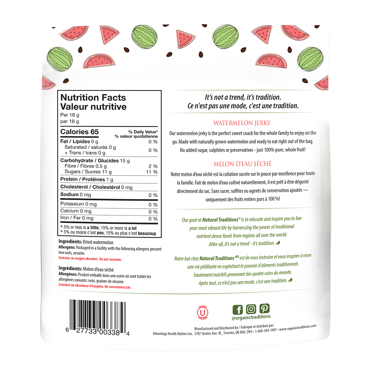 • Naturally grown, whole ripe watermelons that are peeled, sliced and dried in state-of-the-art industrial ovens