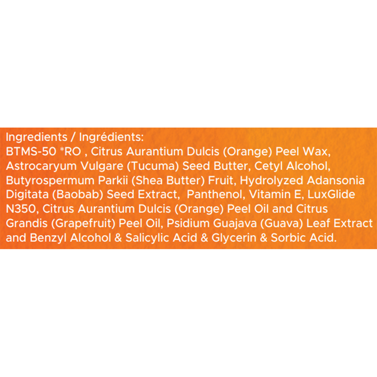 BTMS-50 *RO, Citrus Aurantium Dulcis (Orange) Peel Wax, Astrocaryum Vulgare (Tucuma) Seed Butter, Cetyl Alcohol, Butyrospermum Parkii (Shea Butter) Fruit, Hydrolyzed Adansonia Digitata (Baobab) Seed Extract, Panthenol, Vitamin E, LuxGlide N350, Citrus Aurantium Dulcis (Orange) Peel Oil and Citrus Grandis (Grapefruit) Peel Oil, Psidium Guajava (Guava) Leaf Extract and Benzyl Alcohol & Salicylic Acid & Glycerin & Sorbic Acid.