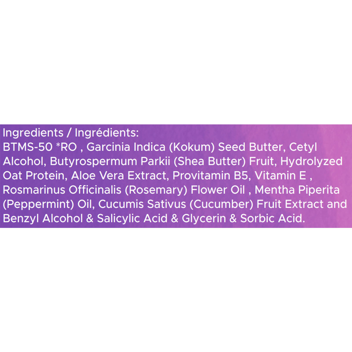 BTMS-50 *RO, Garcinia Indica (Kokum) Seed Butter, Cetyl Alcohol, Butyrospermum Parkii (Shea Butter) Fruit, Hydrolyzed Oat Protein, Aloe Vera Extract, Provitamin B5, Vitamin E, Rosmarinus Officinalis (Rosemary) Flower Oil, Mentha Piperita (Peppermint) Oil, Cucumis Sativus (Cucumber) Fruit Extract and Benzyl Alcohol & Salicylic Acid & Glycerin & Sorbic Acid.