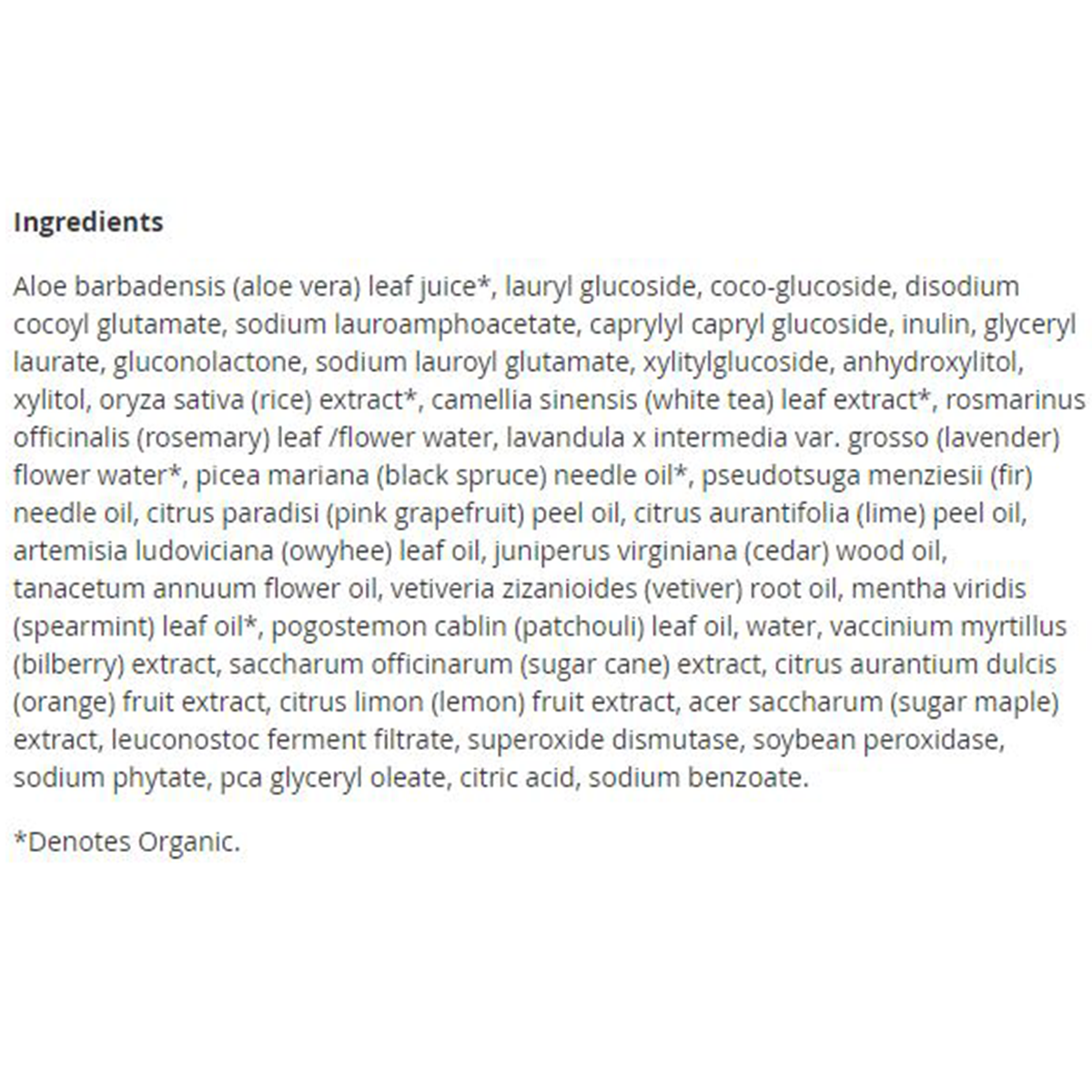 Aloe barbadensis (aloe vera) leaf juice*, lauryl glucoside, coco-glucoside, disodium cocoyl glutamate, sodium lauroamphoacetate, caprylyl capryl glucoside, inulin, glyceryl laurate, gluconolactone, sodium lauroyl glutamate, xylitylglucoside, anhydroxylitol, xylitol, oryza sativa (rice) extract*, camellia sinensis (white tea) leaf extract*, rosmarinus officinalis (rosemary) leaf /flower water, lavandula x intermedia var. grosso (lavender) flower water*, picea mariana (black spruce) needle oil*, pseudotsuga menziesii (fir) needle oil, citrus paradisi (pink grapefruit) peel oil, citrus aurantifolia (lime) peel oil, artemisia ludoviciana (owyhee) leaf oil, juniperus virginiana (cedar) wood oil, tanacetum annuum flower oil, vetiveria zizanioides (vetiver) root oil, mentha viridis (spearmint) leaf oil*, pogostemon cablin (patchouli) leaf oil, water, vaccinium myrtillus (bilberry) extract, saccharum officinarum (sugar cane) extract, citrus aurantium dulcis (orange) fruit extract, citrus limon (lemon) fruit extract, acer saccharum (sugar maple) extract, leuconostoc ferment filtrate, superoxide dismutase, soybean peroxidase, sodium phytate, pca glyceryl oleate, citric acid, sodium benzoate.