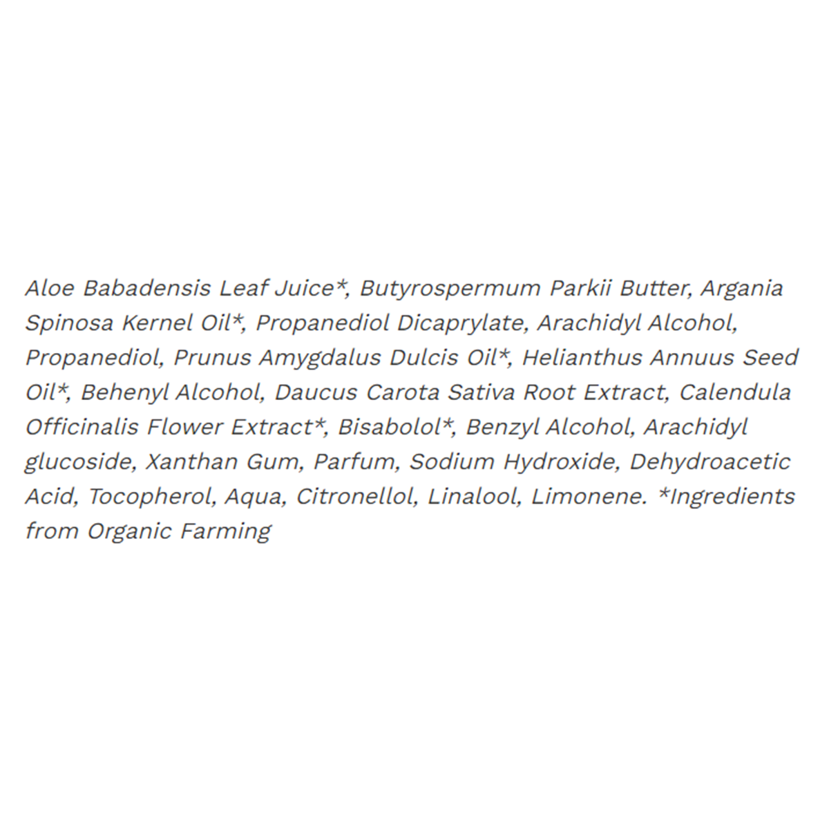 Aloe Babadensis Leaf Juice*, Butyrospermum Parkii Butter, Argania Spinosa Kernel Oil*, Propanediol Dicaprylate, Arachidyl Alcohol, Propanediol, Prunus Amygdalus Dulcis Oil*, Helianthus Annuus Seed Oil*, Behenyl Alcohol, Daucus Carota Sativa Root Extract, Calendula Officinalis Flower Extract*, Bisabolol*, Benzyl Alcohol, Arachidyl glucoside, Xanthan Gum, Parfum, Sodium Hydroxide, Dehydroacetic Acid, Tocopherol, Aqua, Citronellol, Linalool, Limonene. *Ingredients from Organic FarmingAloe Babadensis Leaf Juice*, Butyrospermum Parkii Butter, Argania Spinosa Kernel Oil*, Propanediol Dicaprylate, Arachidyl Alcohol, Propanediol, Prunus Amygdalus Dulcis Oil*, Helianthus Annuus Seed Oil*, Behenyl Alcohol, Daucus Carota Sativa Root Extract, Calendula Officinalis Flower Extract*, Bisabolol*, Benzyl Alcohol, Arachidyl glucoside, Xanthan Gum, Parfum, Sodium Hydroxide, Dehydroacetic Acid, Tocopherol, Aqua, Citronellol, Linalool, Limonene. *Ingredients from Organic Farming