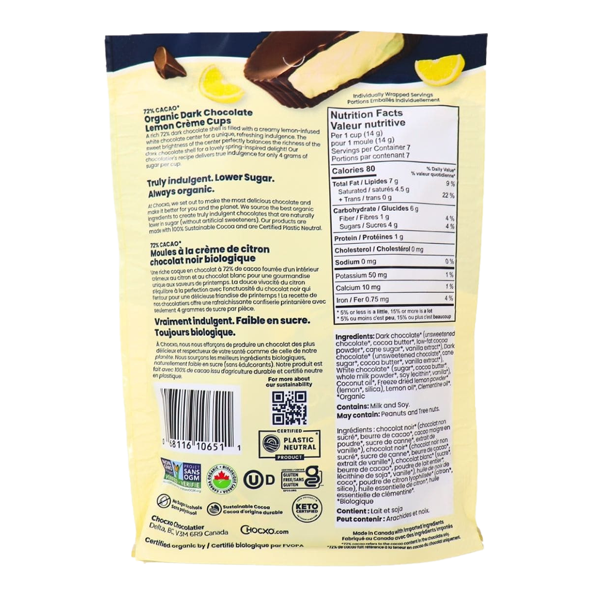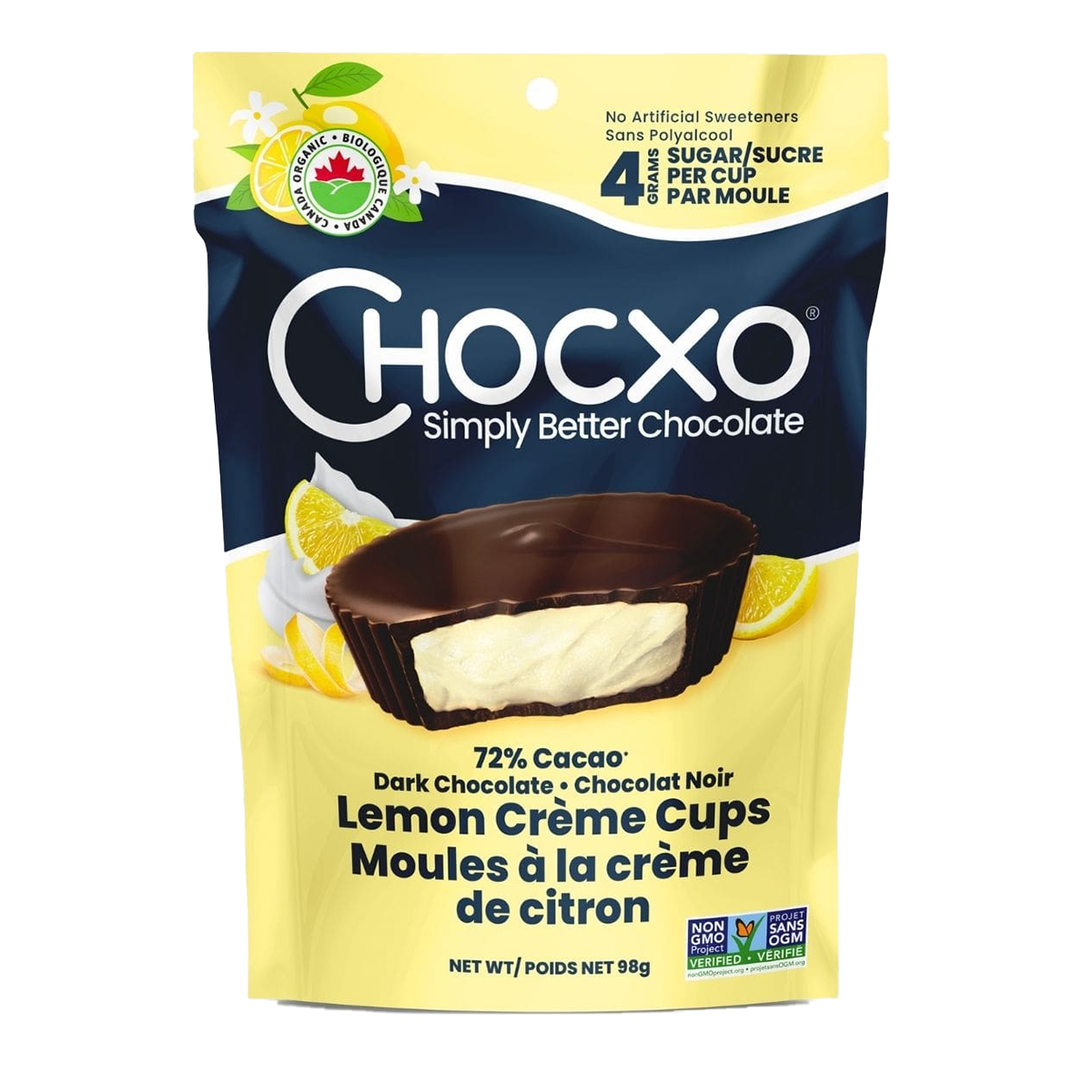 When faced with lemons, ChocXO didn’t settle for lemonade; they transformed them into dark chocolate lemon creme cups! Encased in a luxurious dark chocolate shell, these treats hold a delightful surprise—a luscious lemon-infused white chocolate center just waiting to be discovered! The infusion of lemon brings a sweet and tangy contrast that harmonizes flawlessly with the velvety depth of the dark chocolate coating. Refreshing, tangy, and indulgently decadent, each cup contains only 4g of sugar, allowing you to relish the flavor without any guilt weighing you down!
