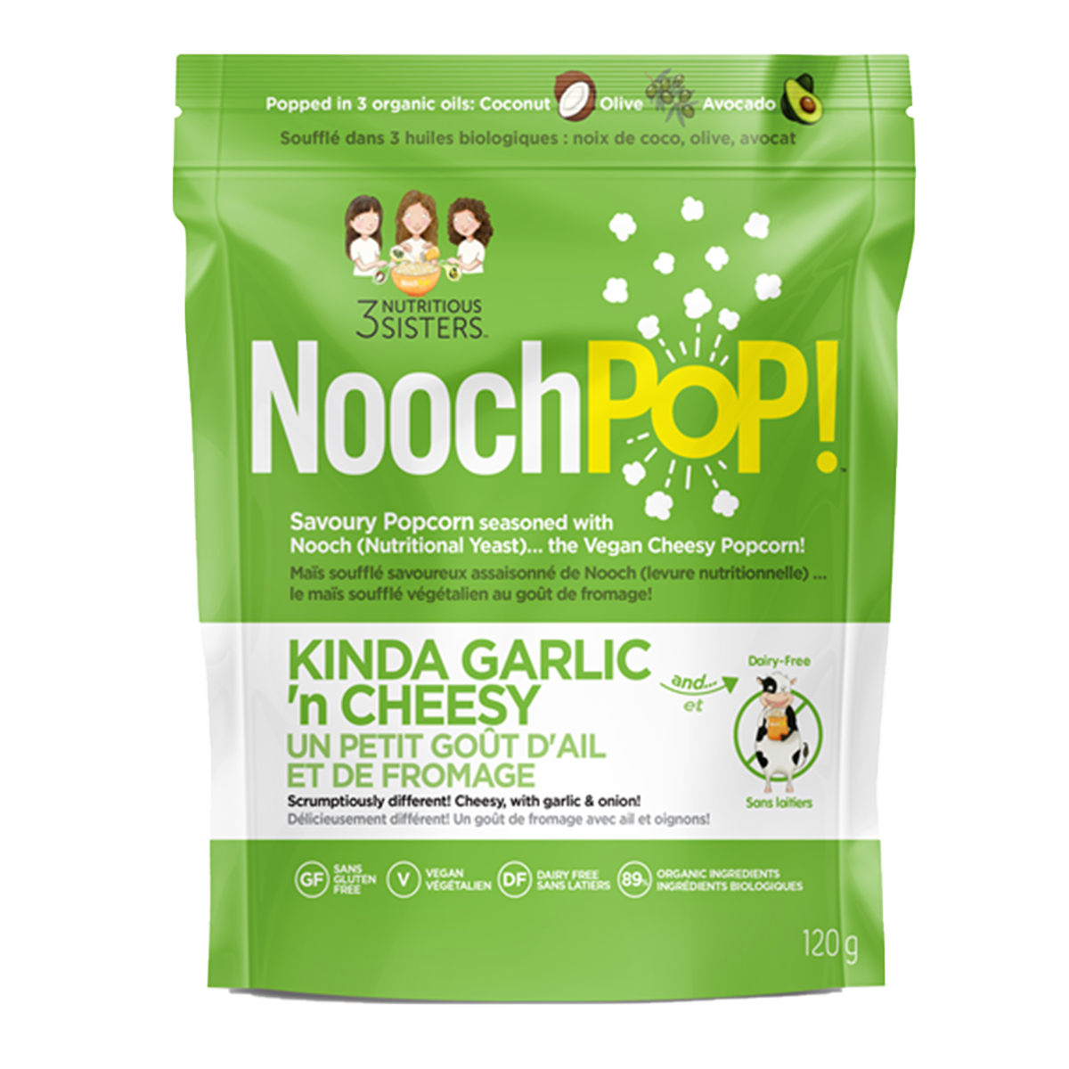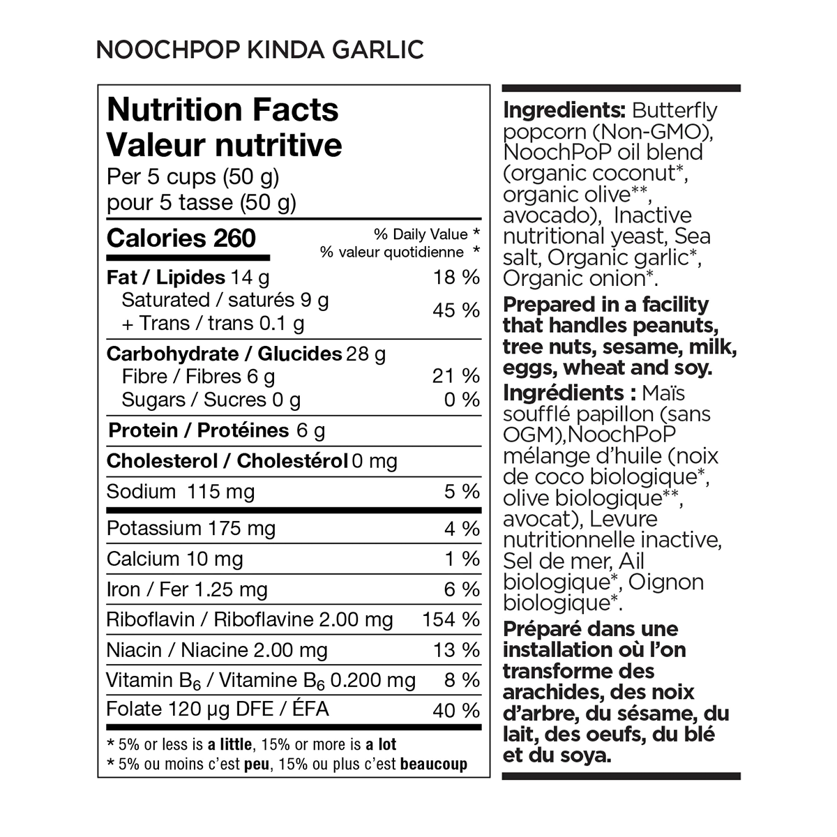 Butterfly popcorn (Non-GMO), NoochPoP oil blend (organic coconut*, organic olive**, avocado), Inactive nutritional yeast, Sea salt, Organic garlic*, Organic onion*.