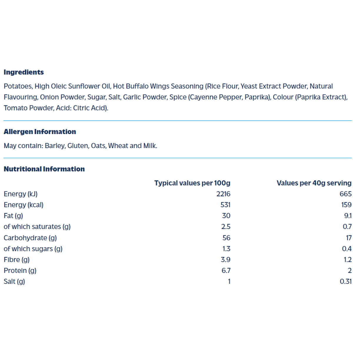 Potatoes, High Oleic Sunflower Oil, Hot Buffalo Wings Seasoning (Rice Flour, Yeast Extract Powder, Natural Flavouring, Onion Powder, Sugar, Salt, Garlic Powder, Spice (Cayenne Pepper, Paprika), Colour (Paprika Extract), Tomato Powder, Acid: Citric Acid).