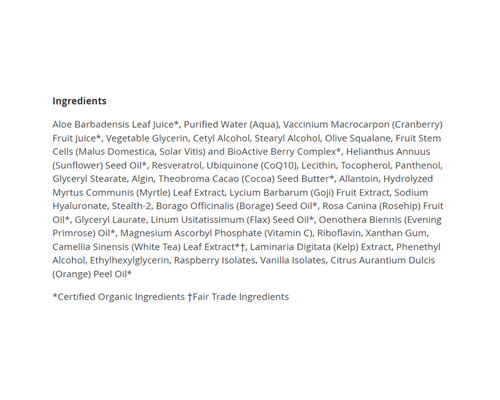 Aloe Barbadensis Leaf Juice*, Purified Water (Aqua), Vaccinium Macrocarpon (Cranberry) Fruit Juice*, Vegetable Glycerin, Cetyl Alcohol, Stearyl Alcohol, Olive Squalane, Fruit Stem Cells (Malus Domestica, Solar Vitis) and BioActive Berry Complex*, Helianthus Annuus (Sunflower) Seed Oil*, Resveratrol, Ubiquinone (CoQ10), Lecithin, Tocopherol, Panthenol, Glyceryl Stearate, Algin, Theobroma Cacao (Cocoa) Seed Butter*, Allantoin, Hydrolyzed Myrtus Communis (Myrtle) Leaf Extract, Lycium Barbarum (Goji) Fruit Extract, Sodium Hyaluronate, Stealth-2, Borago Officinalis (Borage) Seed Oil*, Rosa Canina (Rosehip) Fruit Oil*, Glyceryl Laurate, Linum Usitatissimum (Flax) Seed Oil*, Oenothera Biennis (Evening Primrose) Oil*, Magnesium Ascorbyl Phosphate (Vitamin C), Riboflavin, Xanthan Gum, Camellia Sinensis (White Tea) Leaf Extract*†, Laminaria Digitata (Kelp) Extract, Phenethyl Alcohol, Ethylhexylglycerin, Raspberry Isolates, Vanilla Isolates, Citrus Aurantium Dulcis (Orange) Peel Oil* *Certified Organic Ingredients †Fair Trade Ingredients.