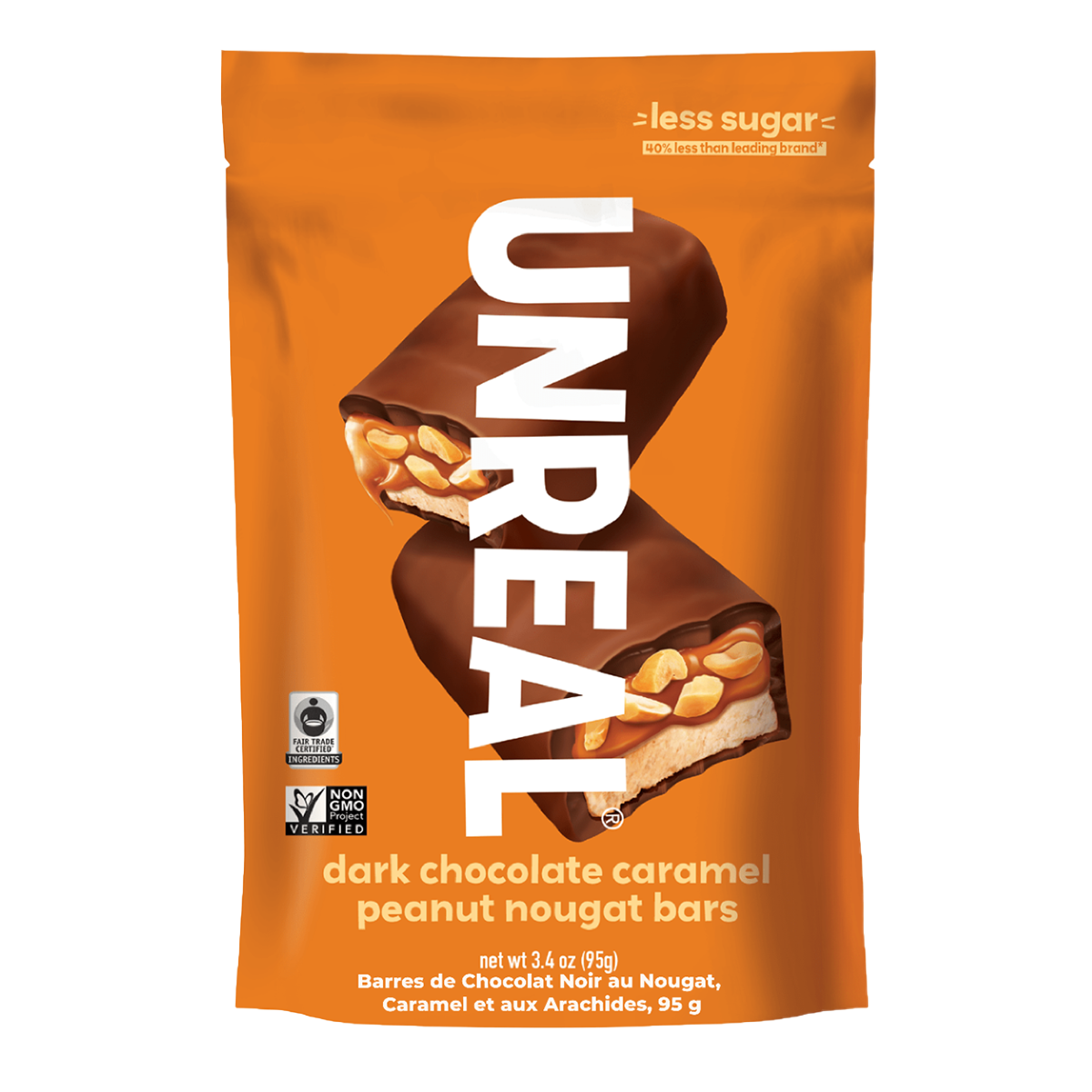 Dark Chocolate Caramel Peanut Nougat Bars - We started UNREAL so everyone can enjoy out of this world, all natural chocolate snacks without all the sugar. Our caramel peanut nougat bars are made with over 70% organic ingredients. They’re non-gmo, fair trade and sweetened without corn syrup or sugar alcohols. We just use less sugar. For real. And the taste is UNREAL!