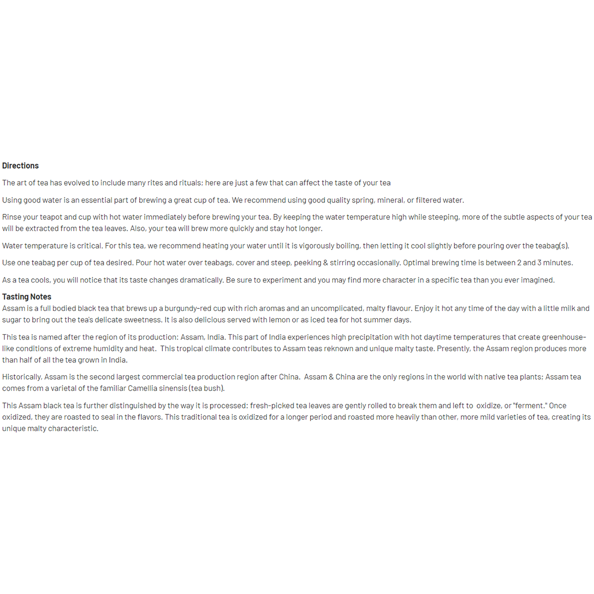 Assam is a full bodied black tea that brews up a burgundy-red cup with rich aromas and an uncomplicated, malty flavour. Enjoy it hot any time of the day with a little milk and sugar to bring out the tea's delicate sweetness. It is also delicious served with lemon or as iced tea for hot summer days.