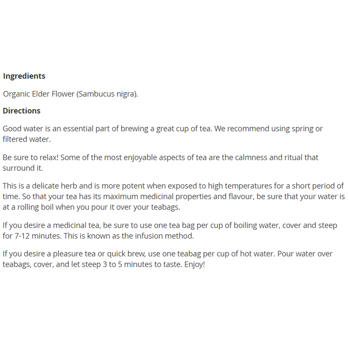 Due to its traditional use by Native Americans and its continued popularity today, Elder Flower is often referred to as the "medicine chest of the country people." We hope you enjoy this wonderful tea.
