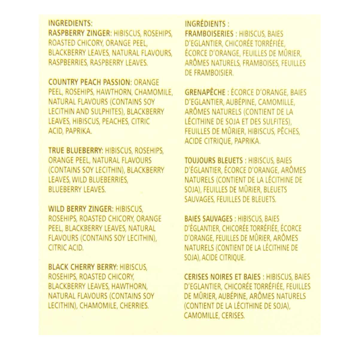 Wild berry zinger: hibiscus, rosehips, roasted chicory, orange peel, blackberry leaves, natural flavours (contains soy lecithin), citric acid.