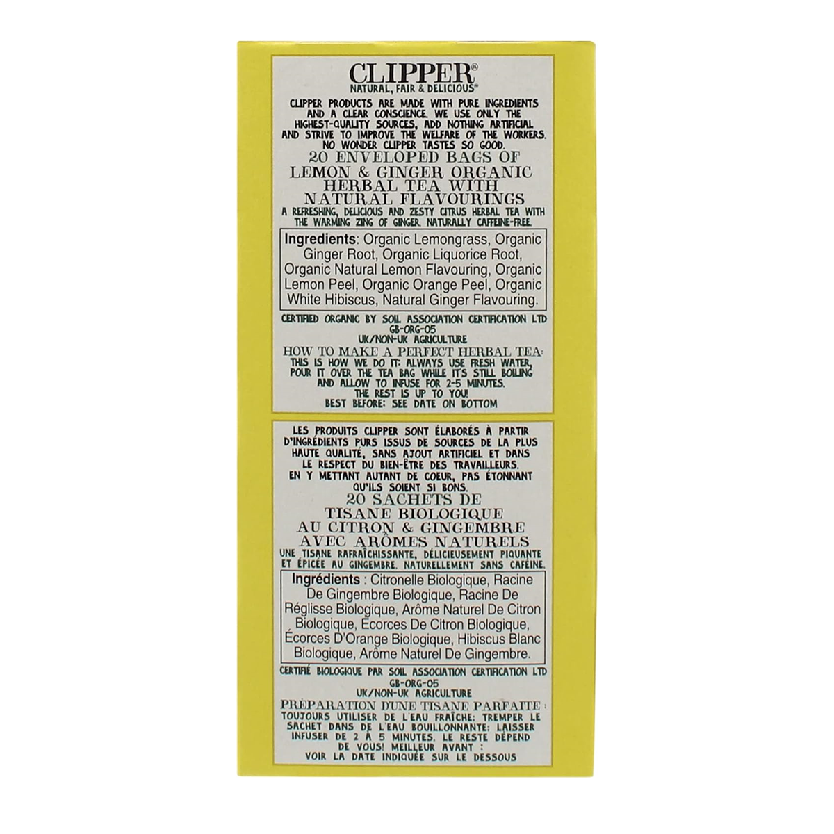 Organic Lemongrass, Organic Ginger Root, Organic Liquorice Root, Organic Natural Lemon Flavouring, Organic Lemon Peel, Organic Orange Peel, Organic White Hibiscus, Natural Ginger Flavouring.