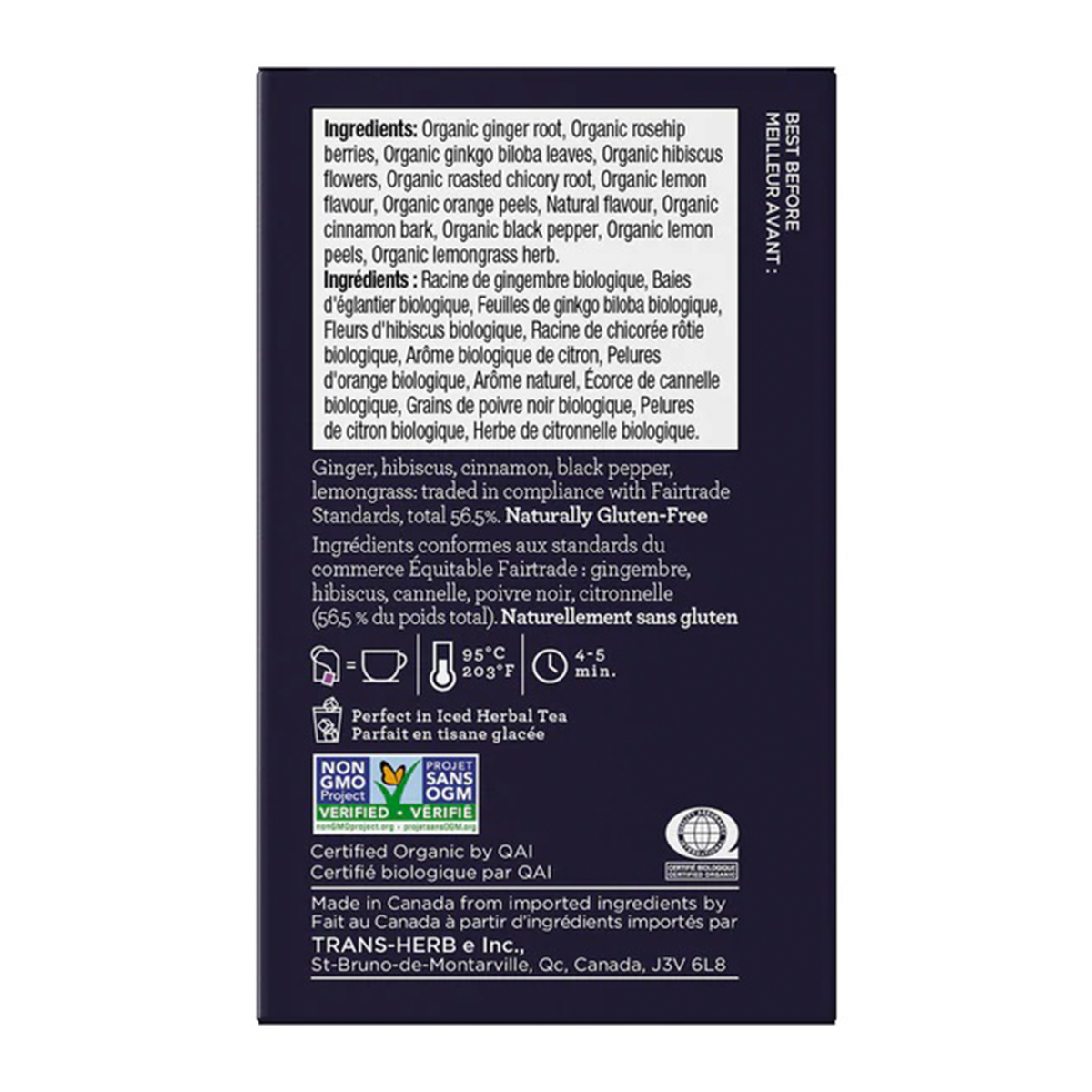 Organic ginger root, Organic rosehip berries, Organic ginkgo biloba leaves, Organic hibiscus flowers, Organic roasted chicory root, Organic lemon flavour, Organic orange peels, Natural flavour, Organic cinnamon bark, Organic black pepper, Organic lemon peels, Organic lemongrass herb. Ginger, hibiscus, cinnamon, black pepper, lemongrass: traded in compliance with Fairtrade Standards, total 56.5%.