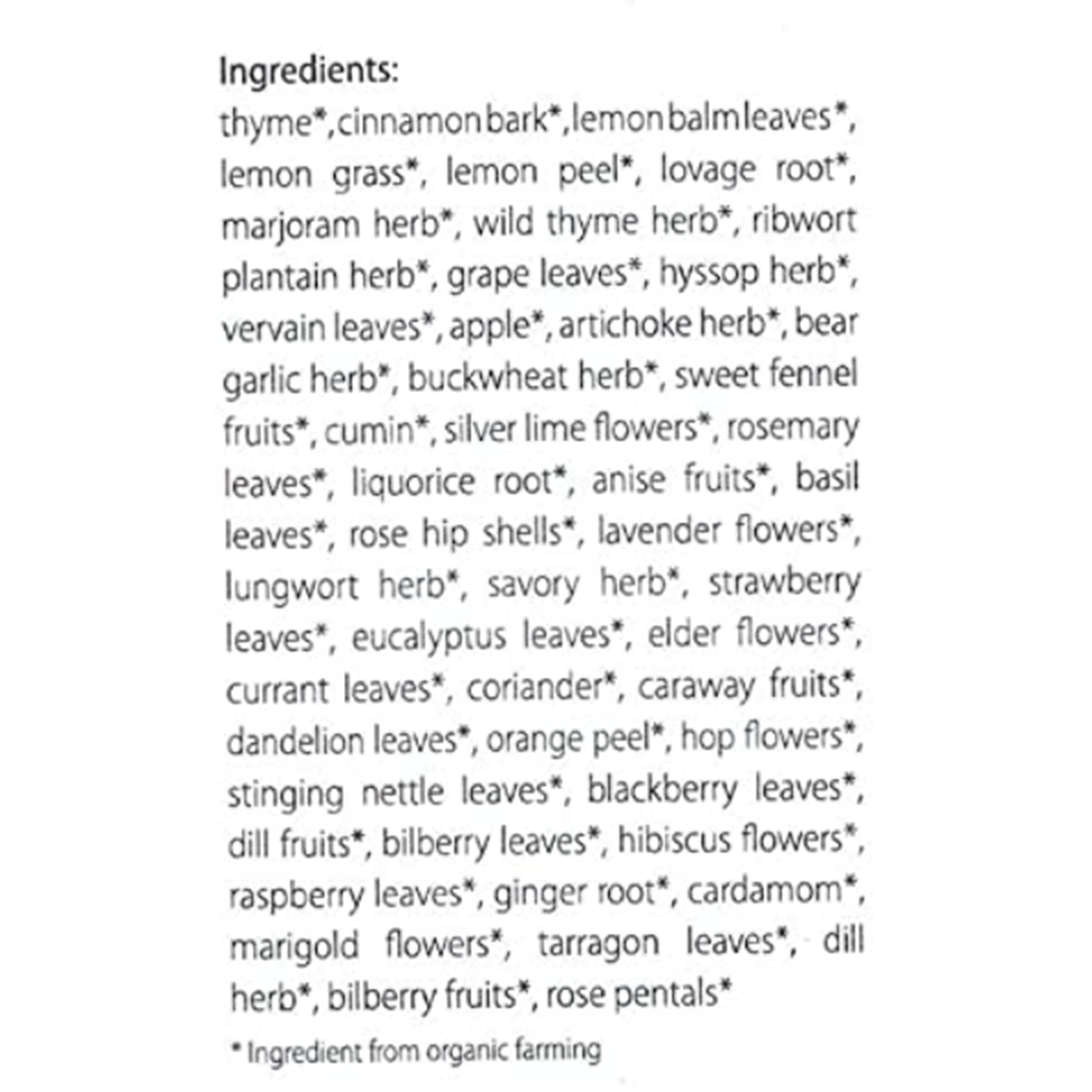 Thyme *, cinnamon bark *, lemon balm leaves *, lemongrass *, lemon peel *, lovage root *, marjoram herb *, quince herb *, ribwort herb *, vine leaves *, hyssop herb *, lemon verbena leaves *, apple *, artichoke herb *, wild garlic herb *, buckwheat herb *, buckwheat herb *, buckwheat herb * sweet *, cumin *, silver linden flowers *, rosemary leaves *, liquorice root *, aniseed fruits *, basil leaves *, rose hip peels *, lavender flowers *, lungwort *, savory *, strawberry leaves *, eucalyptus leaves *, elderflower *, currant leaves *, coriander *, Dandelion leaves *, orange peel *, hop flowers *, nettle.