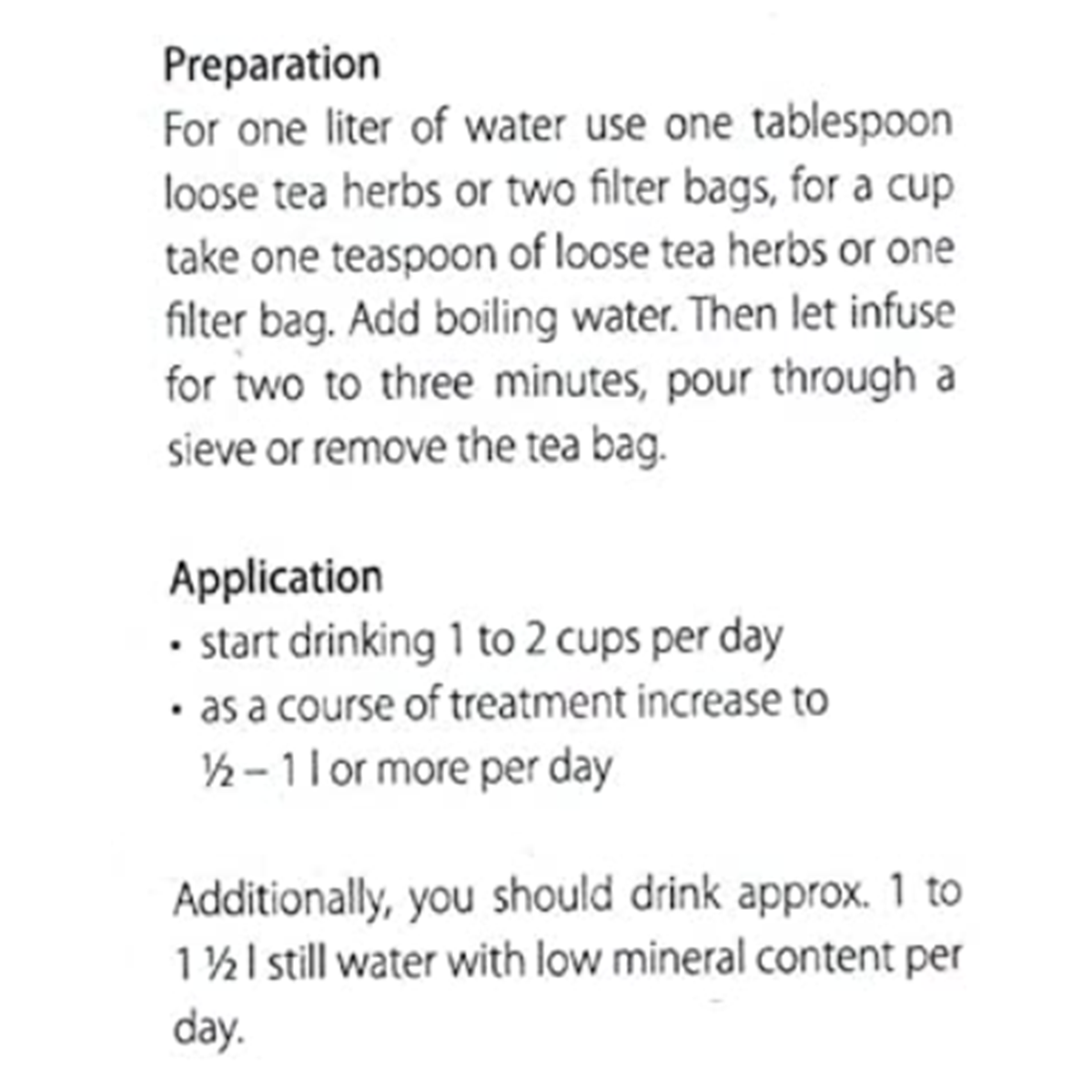 For one liter of water use one tablespoon loose tea herbs or two filter bags, for a cup take one teaspoon of loose tea herbs or one filter bag. Add boiling water. Then let infuse for two to three minutes, pour through a sieve or remove the tea bag.