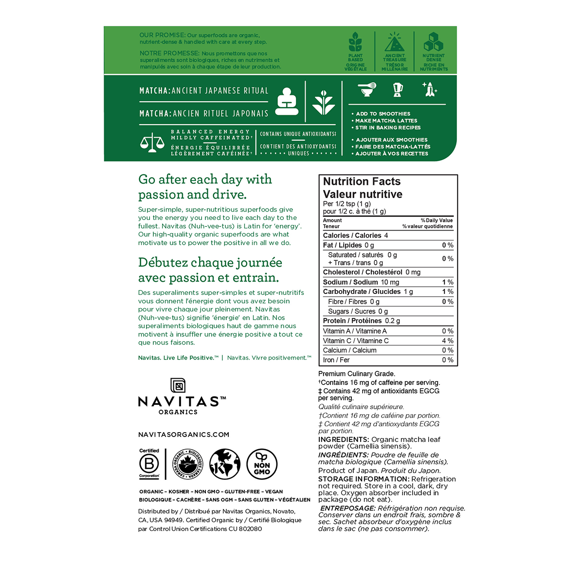 Navitas Organics Matcha Powder is premium culinary grade and organically grown in its native Japan. Smooth and earthy, it’s perfect for making a traditional cup of tea, whipping up a frothy matcha latte, or adding to your favorite smoothies and desserts!