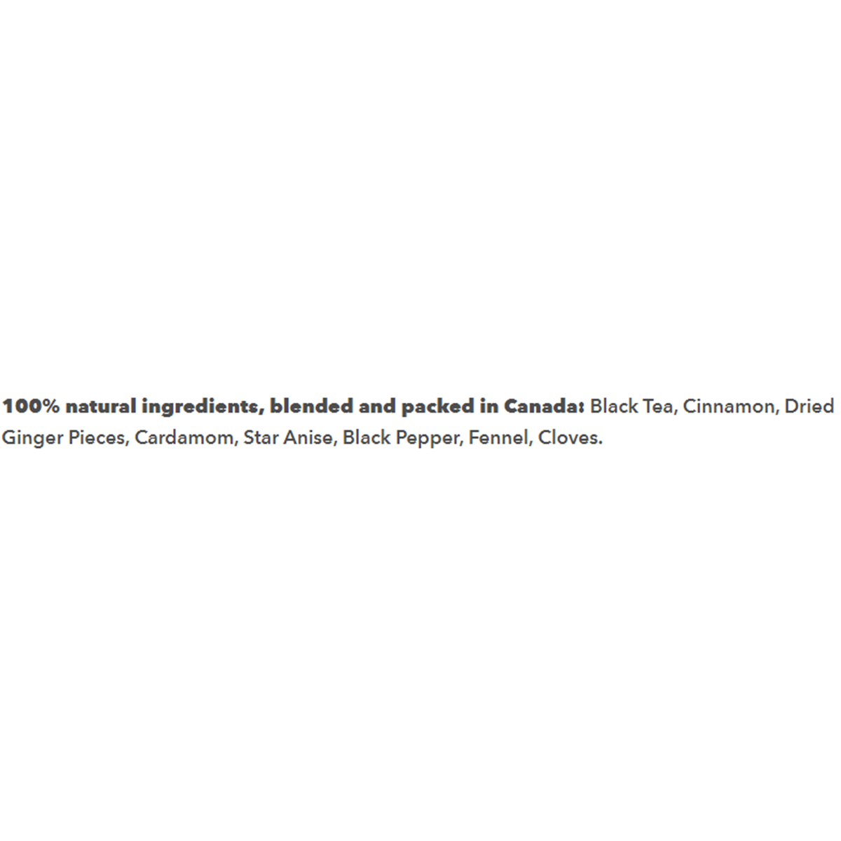 Black Tea, Cinnamon, Dried Ginger Pieces, Cardamom, Star Anise, Black Pepper, Fennel, Cloves.