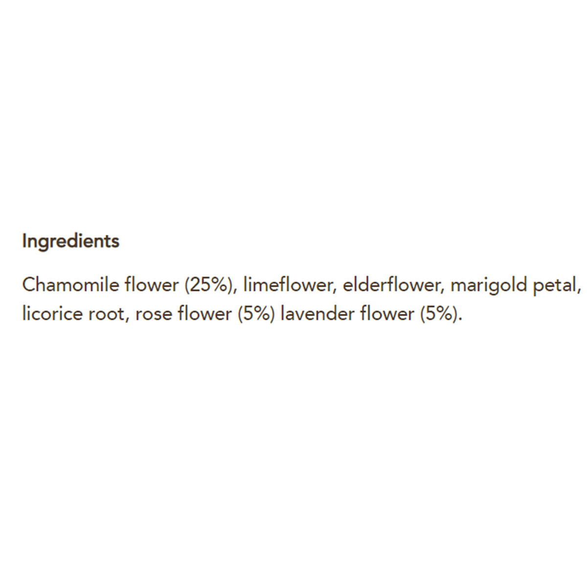 Chamomile flower (25%), limeflower, elderflower, marigold petal, licorice root, rose flower (5%) lavender flower (5%).
