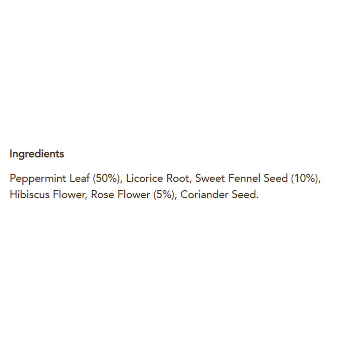 Peppermint Leaf (50%), Licorice Root, Sweet Fennel Seed (10%), Hibiscus Flower, Rose Flower (5%), Coriander Seed.