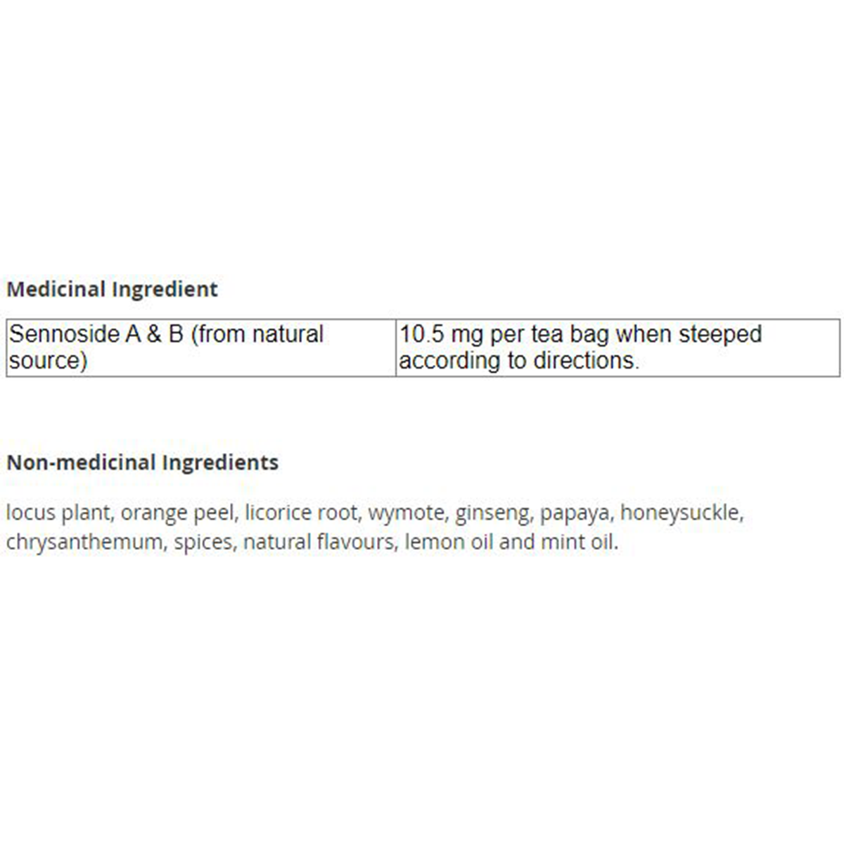 locus plant, orange peel, licorice root, wymote, ginseng, papaya, honeysuckle, chrysanthemum, spices, natural flavours, lemon oil and mint oil.