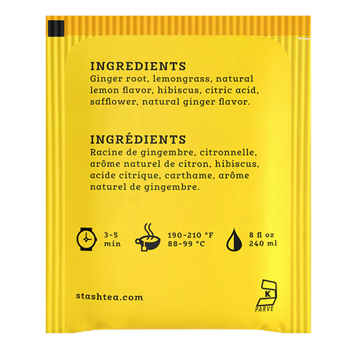 Ginger root, lemongrass, natural lemon flavor, hibiscus, citric acid, safflower, natural ginger flavor.