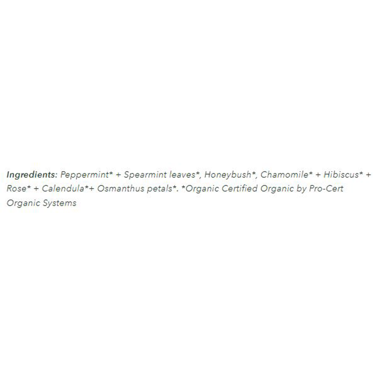 Peppermint* + Spearmint leaves*, Honeybush*, Chamomile* + Hibiscus* + Rose* + Calendula*+ Osmanthus petals*. *Organic Certified Organic by Pro-Cert Organic Systems.