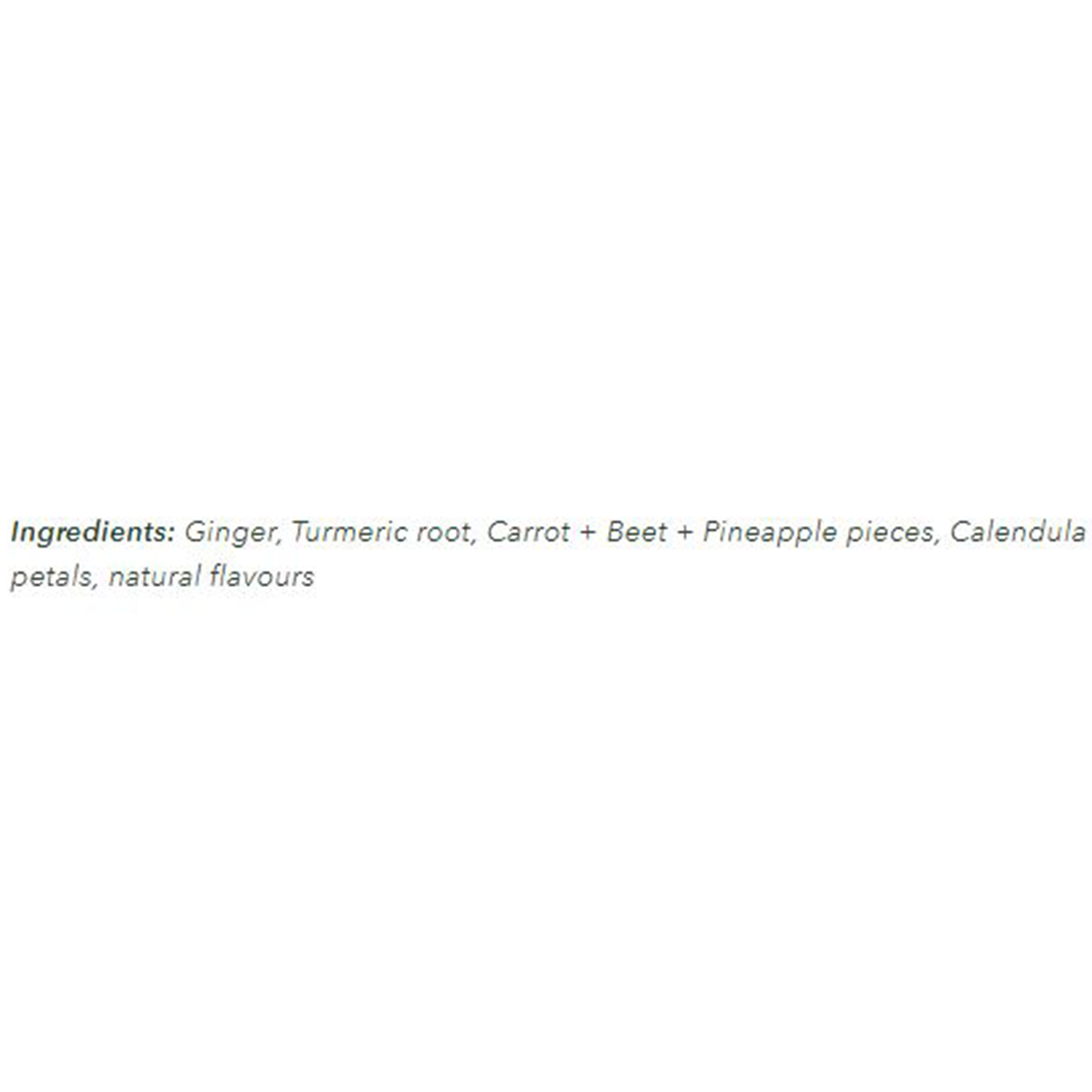 Ginger, Turmeric root, Carrot + Beet + Pineapple pieces, Calendula petals, natural flavours.